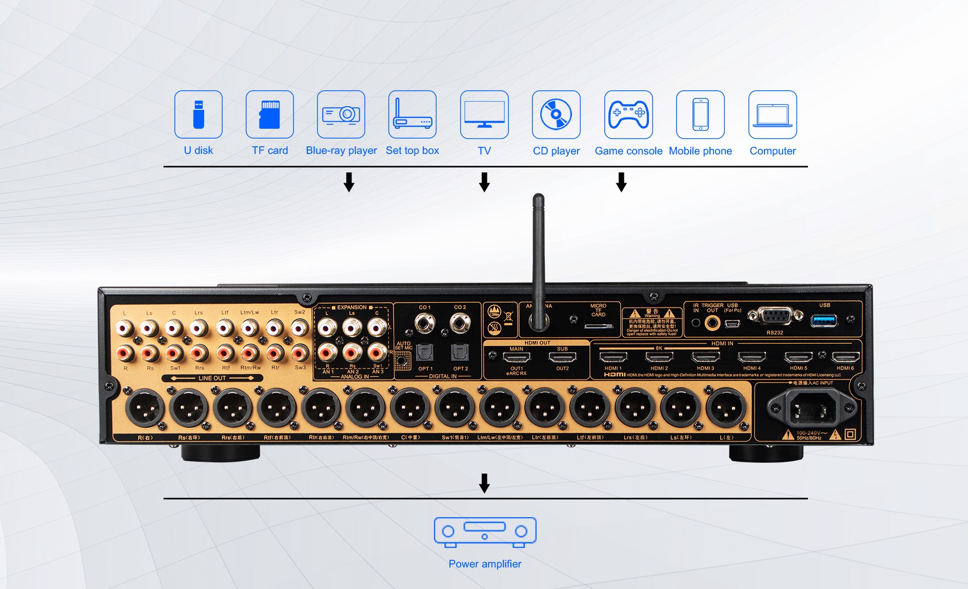 संतुलित आउटपुट के साथ 7.1.6 या 9.1.4 चैनल तक, या असंतुलित आउटपुट के साथ 7.3.6 / 9.3.4 चैनल तक का समर्थन करता है। कई सबवूफर आउटपुट (XLR और RCA) के साथ, AT-500 लगभग किसी भी कमरे के लेआउट या स्पीकर सेटअप के अनुकूल हो जाता है।