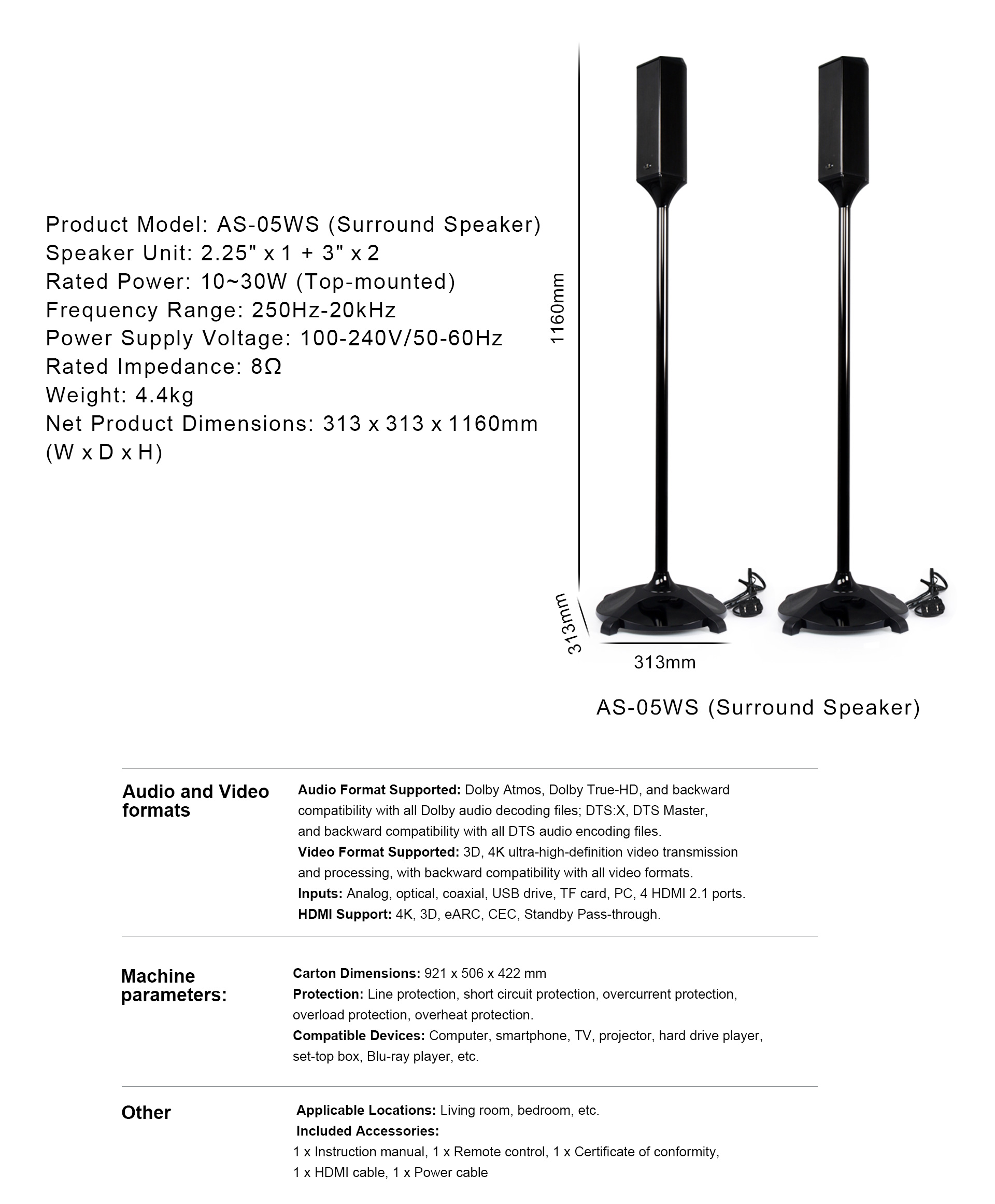 मुख्य स्पीकर और सराउंड स्पीकर चार फुल-रेंज स्पीकरों से सुसज्जित हैं।