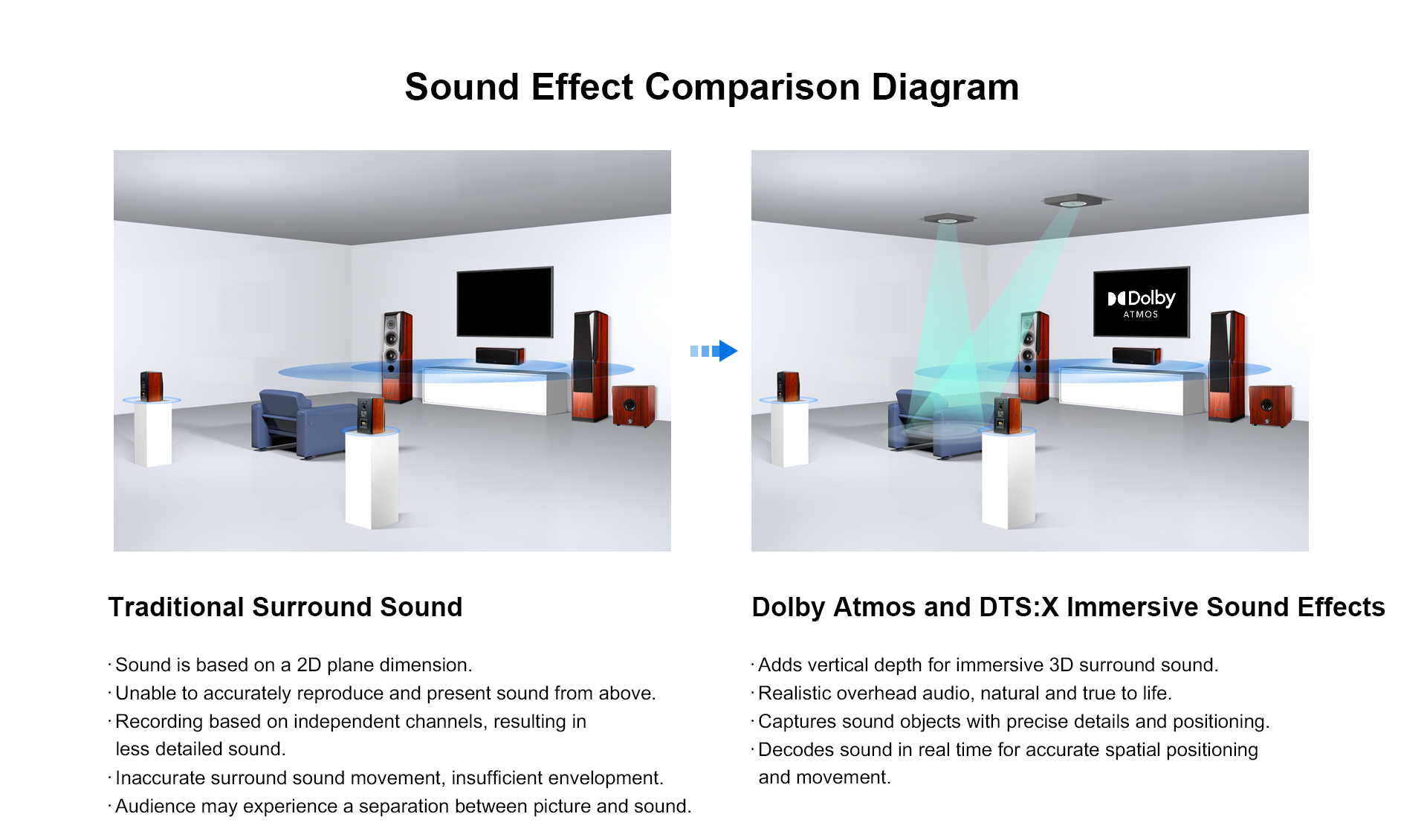 पारंपरिक स्टीरियो या मल्टी-चैनल ऑडियो ट्रैक में स्थानिक स्थिति संकेतों की पहचान करके और पेशेवर डीएसपी एल्गोरिदम का उपयोग करके, एक इमर्सिव 3डी ध्वनि प्रभाव बनाया जाता है।