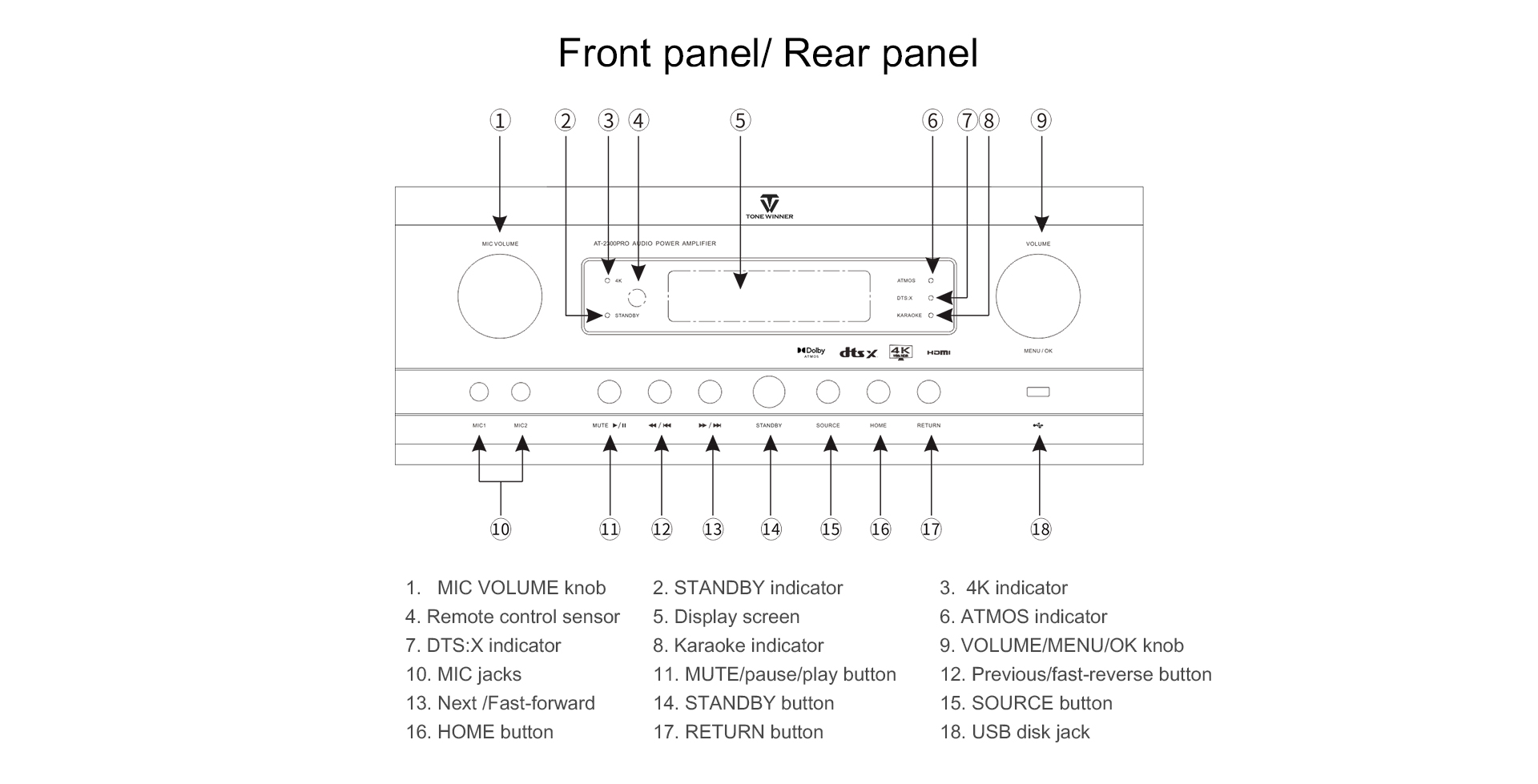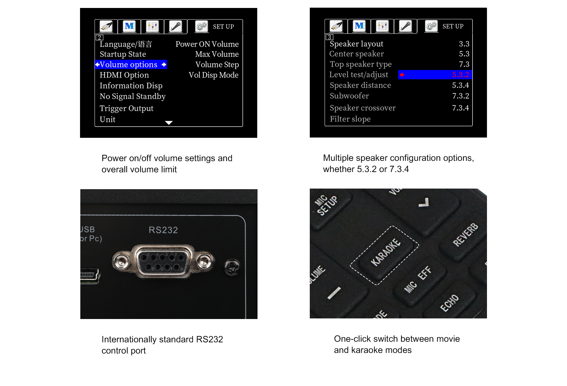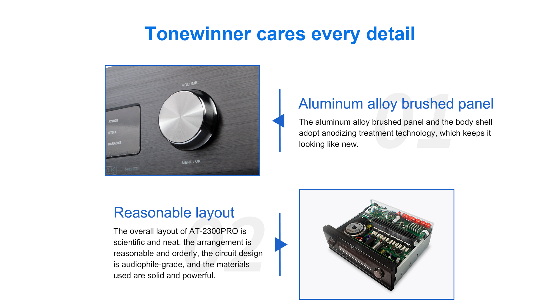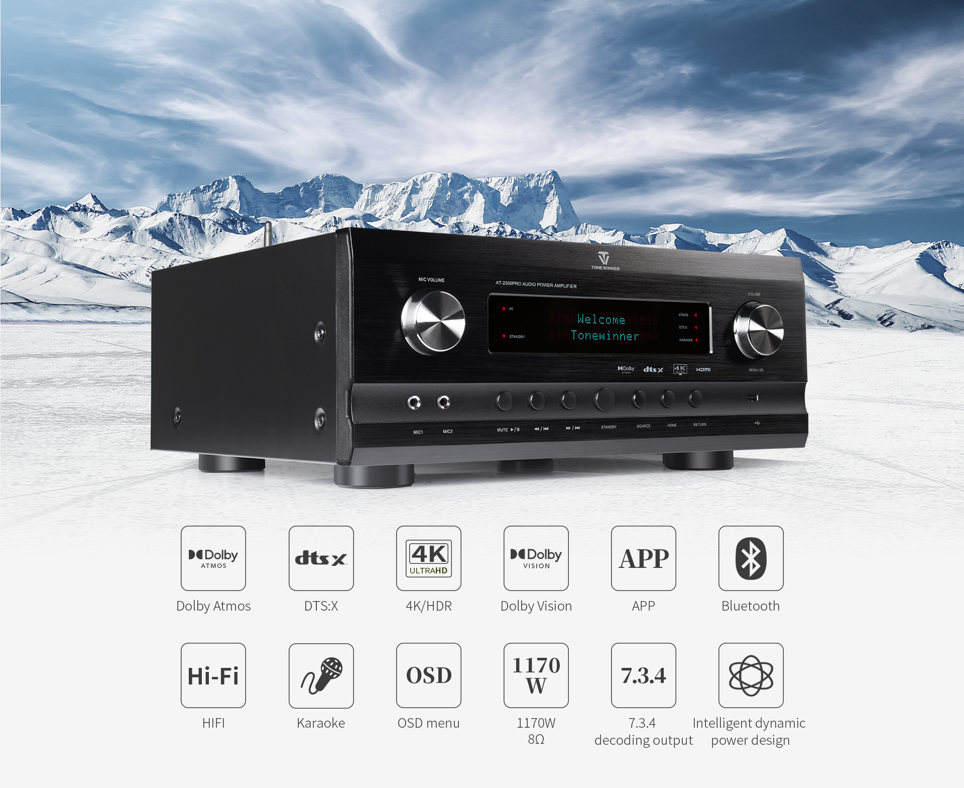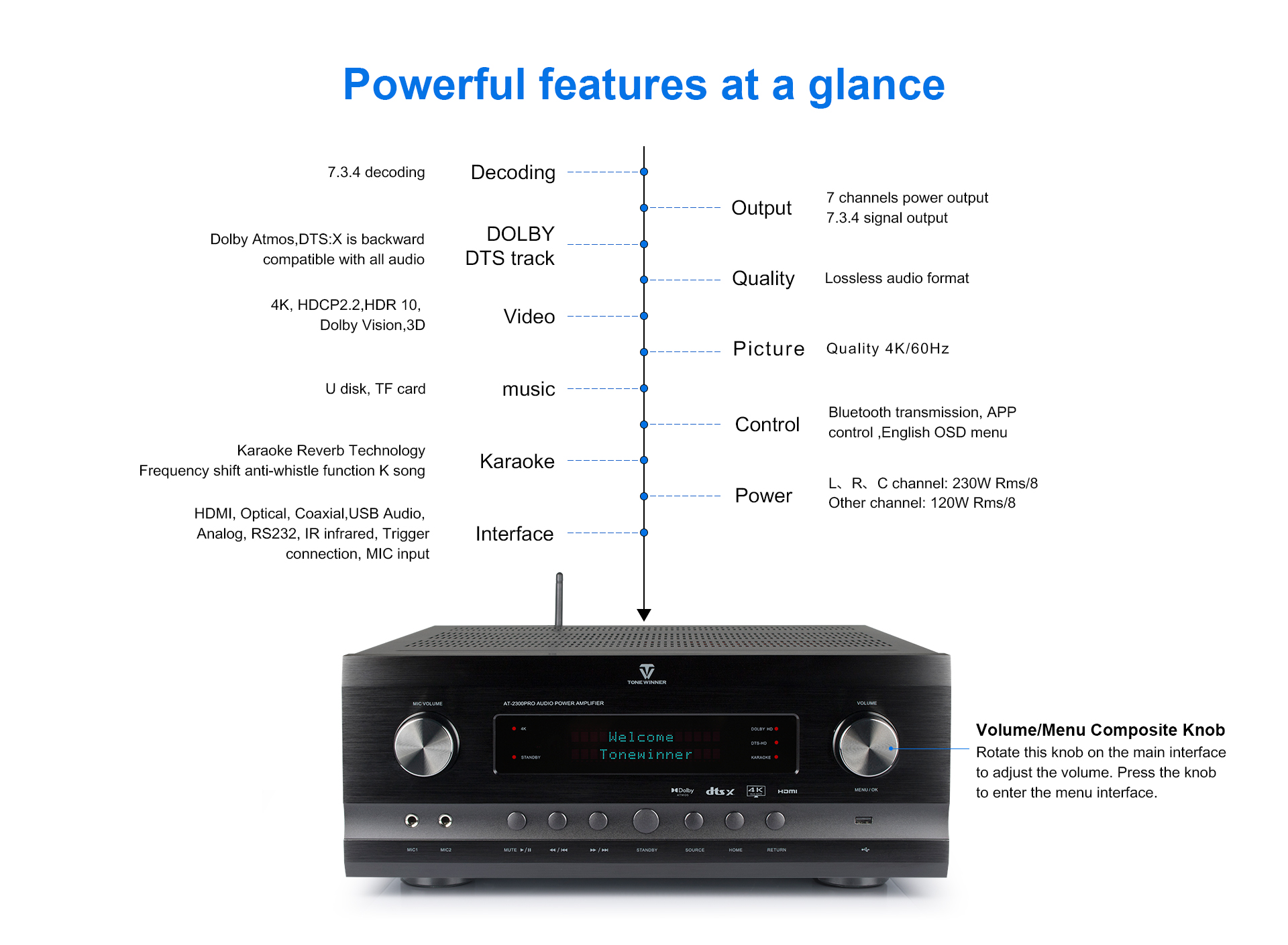 AT-2300PRO एक डॉल्बी एटमॉस थिएटर और कराओके इंटीग्रेटेड एम्पलीफायर है। यह एक ऑल-इन-वन मशीन है जो होम थिएटर सिस्टम, पर्सनल म्यूजिक सेंटर और प्रोफेशनल कराओके सिस्टम को एक साथ जोड़ती है। AT-2300PRO का प्रोफेशनल 5.1.2 चैनल इमर्शन कराओके सिस्टम ऑडियो उद्योग में अग्रणी है। यह ऑडियो रिटर्न चैनल (ARC) को सपोर्ट करता है, जिससे स्मार्ट टीवी को सॉन्ग-ऑर्डर मशीन में बदला जा सकता है।