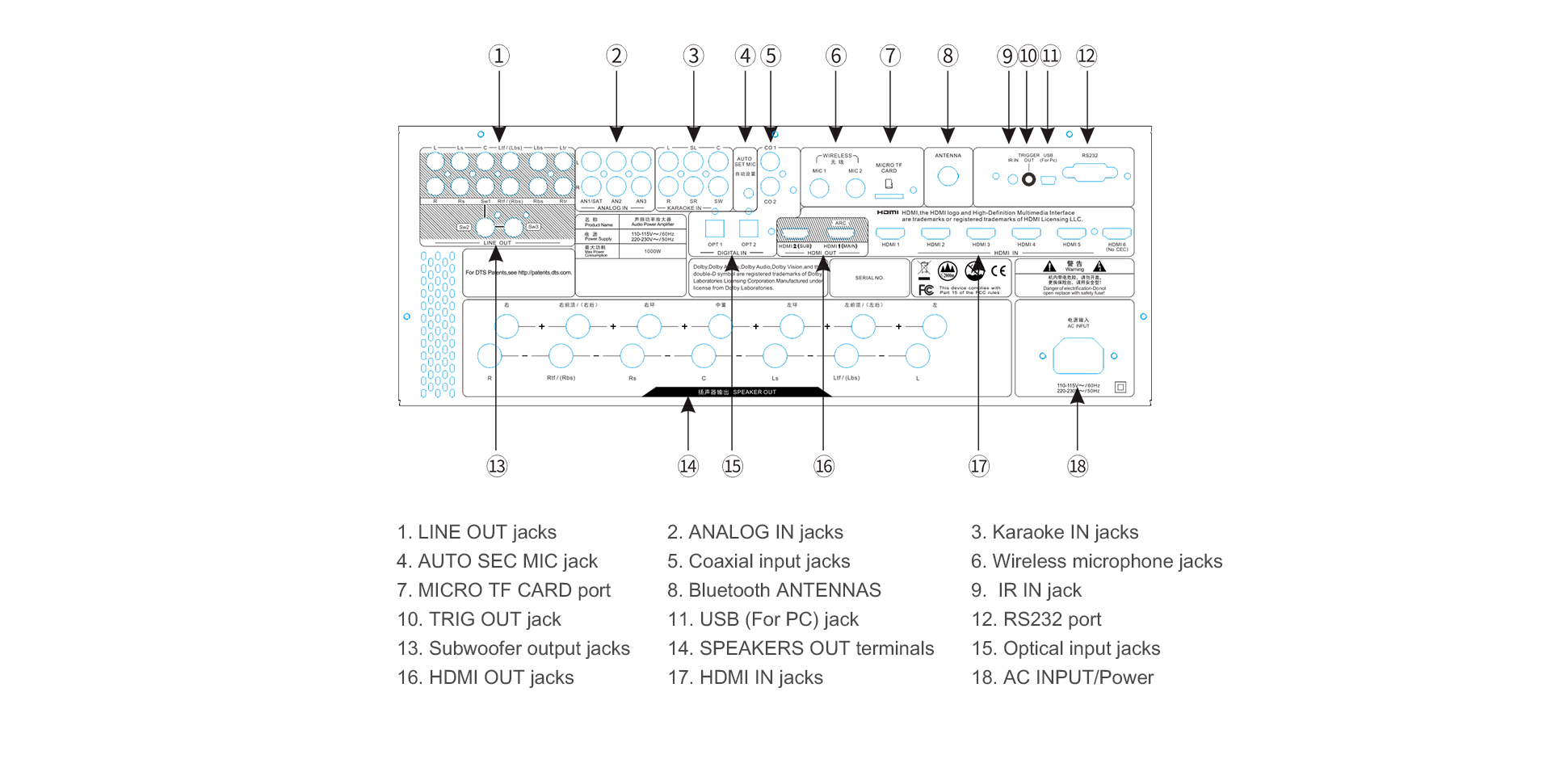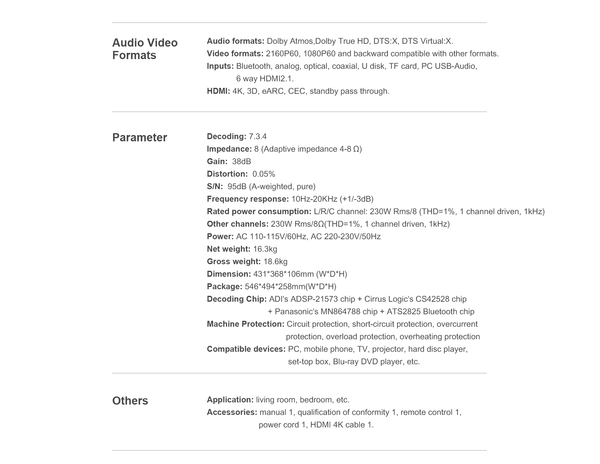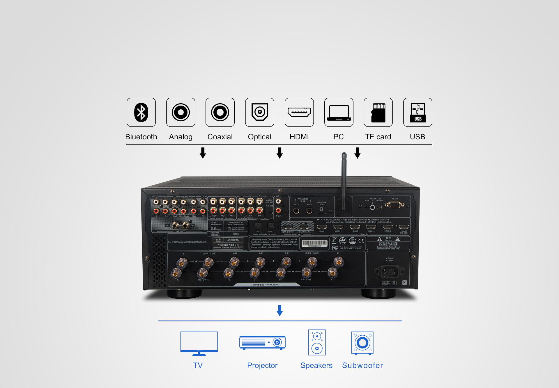 एचडीएमआई 6 इन 2 आउट, एआरसी, ऑप्टिकल/समाक्षीय इनपुट, यू डिस्क/टीएफ कार्ड/पीसी ऑडियो इनपुट, ब्लूटूथ का समर्थन करता है।