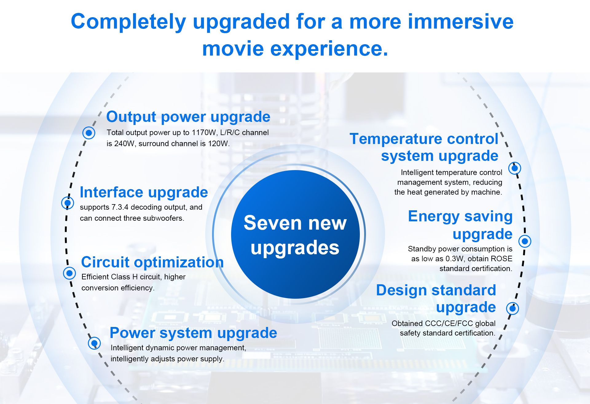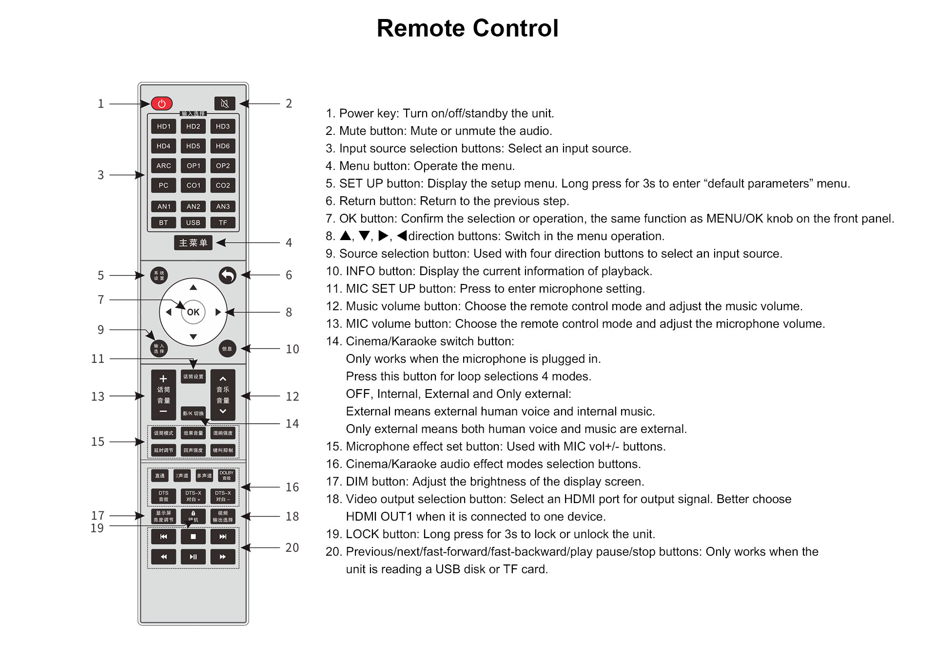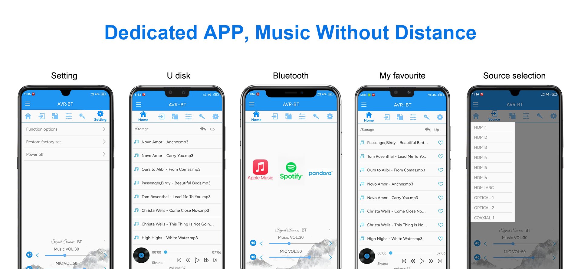 एचडीएमआई 6 इन 2 आउट, एआरसी, ऑप्टिकल/समाक्षीय इनपुट, यू डिस्क/टीएफ कार्ड/पीसी ऑडियो इनपुट, ब्लूटूथ का समर्थन करता है।