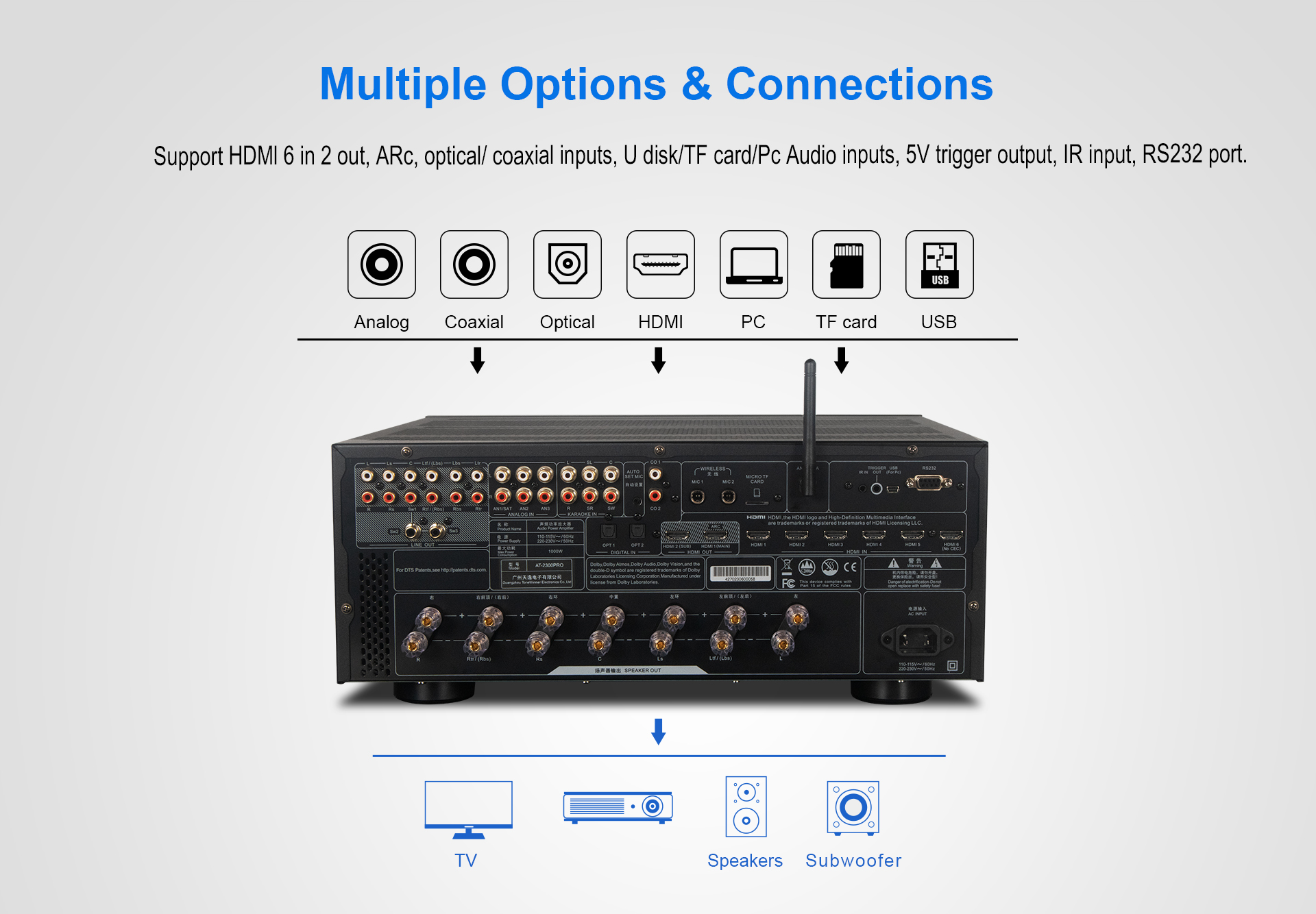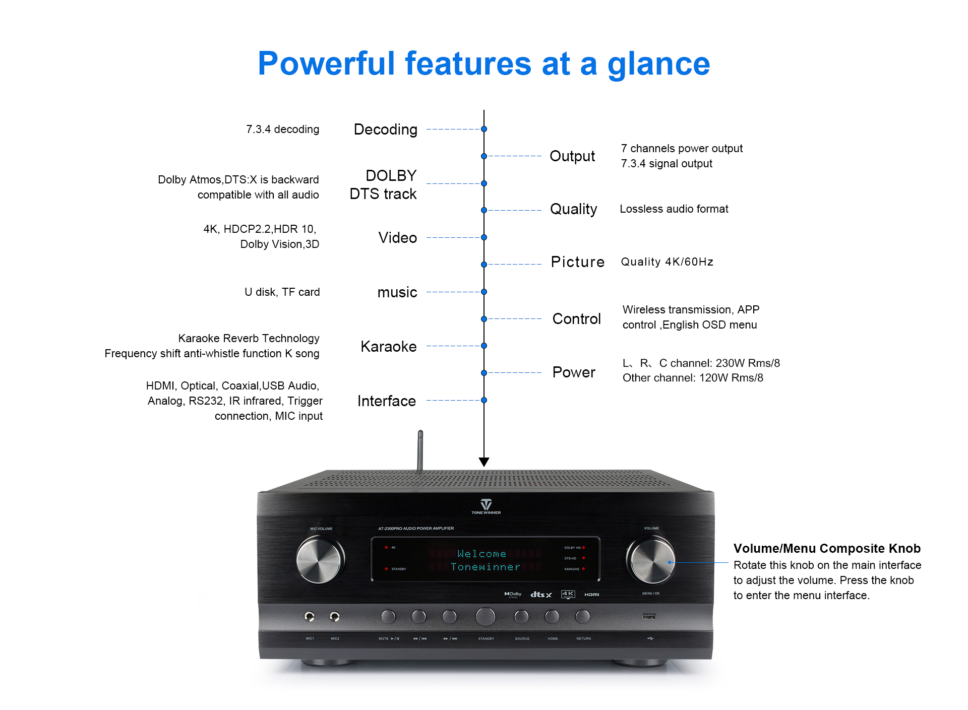 AT-2300PRO एक डॉल्बी एटमॉस थिएटर और कराओके इंटीग्रेटेड एम्पलीफायर है। यह एक ऑल-इन-वन मशीन है जो होम थिएटर सिस्टम, पर्सनल म्यूजिक सेंटर और प्रोफेशनल कराओके सिस्टम को एक साथ जोड़ती है। AT-2300PRO का प्रोफेशनल 5.1.2 चैनल इमर्शन कराओके सिस्टम ऑडियो इंडस्ट्री में अग्रणी है। यह ऑडियो रिटर्न चैनल (ARC) को सपोर्ट करता है, जिससे स्मार्ट टीवी को सॉन्ग-ऑर्डर मशीन में बदला जा सकता है।