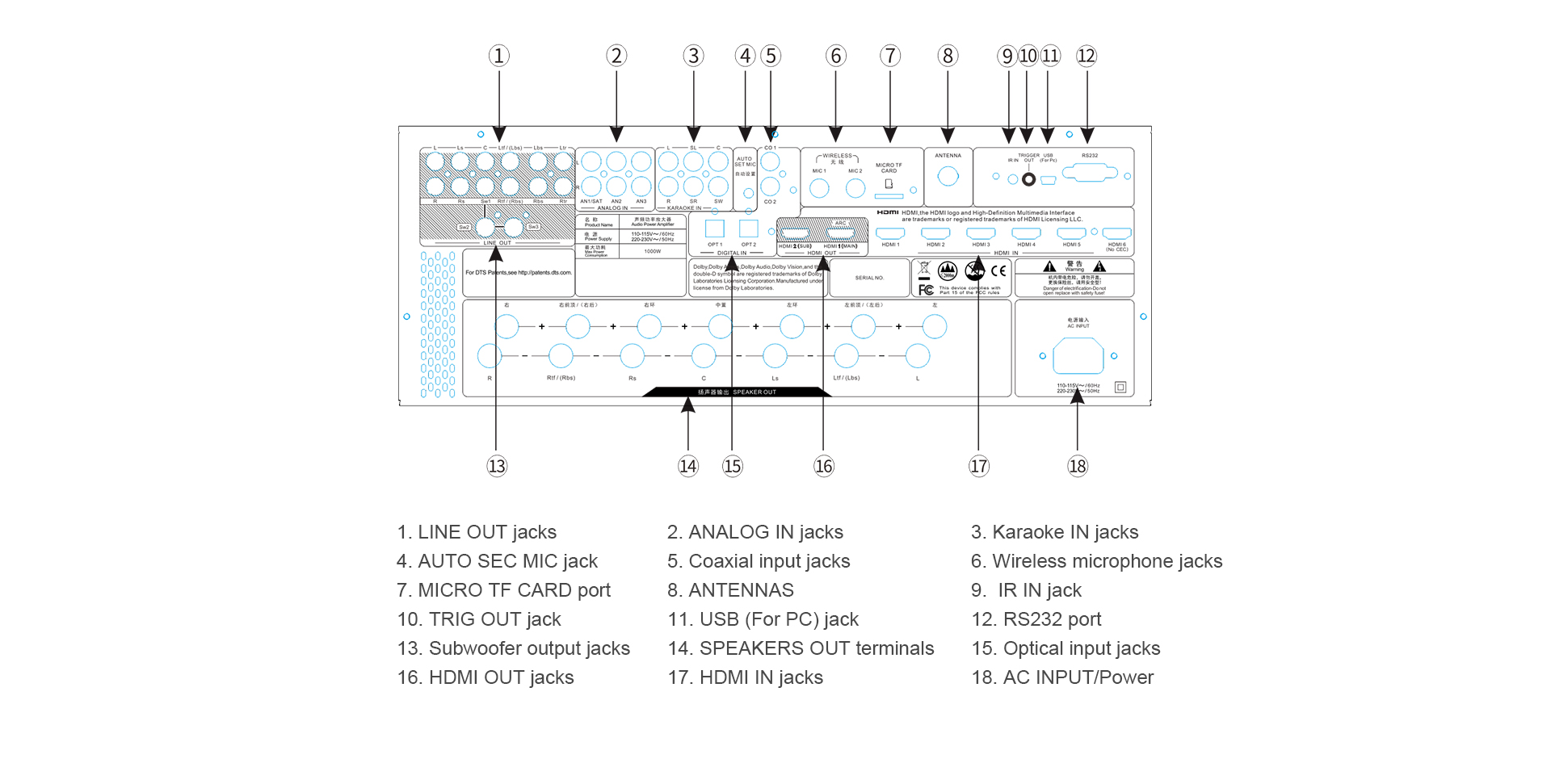 14-चैनल डॉल्बी एटमॉस डिकोडिंग लाइन आउटपुट, स्वतंत्र रूप से प्री-डिकोडर के रूप में कार्य कर सकता है: