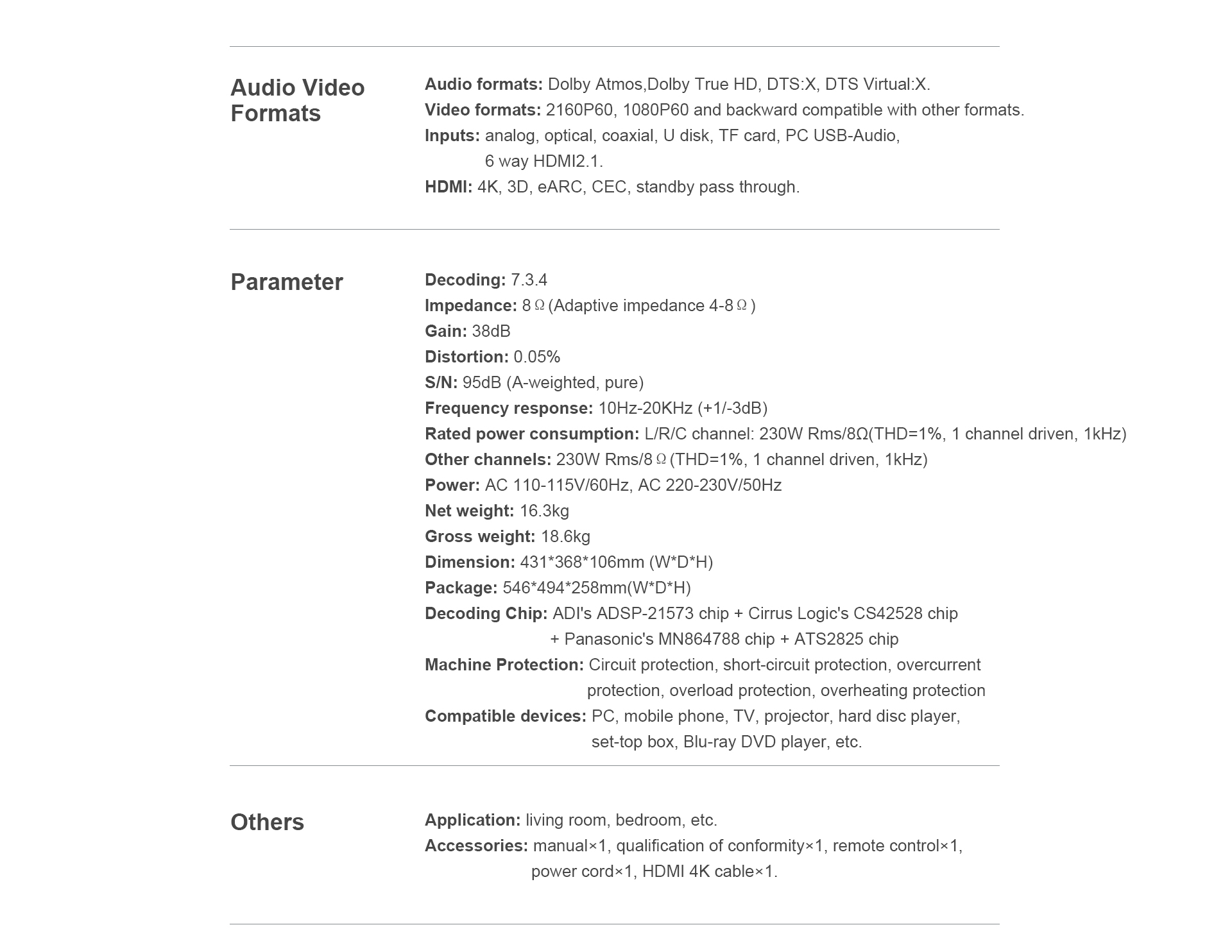 एल, आर, सी मोनो चैनल: 230W आरएमएस/8Ω (टीएचडी=1%, मोनो चैनल, 1केएचजेड)