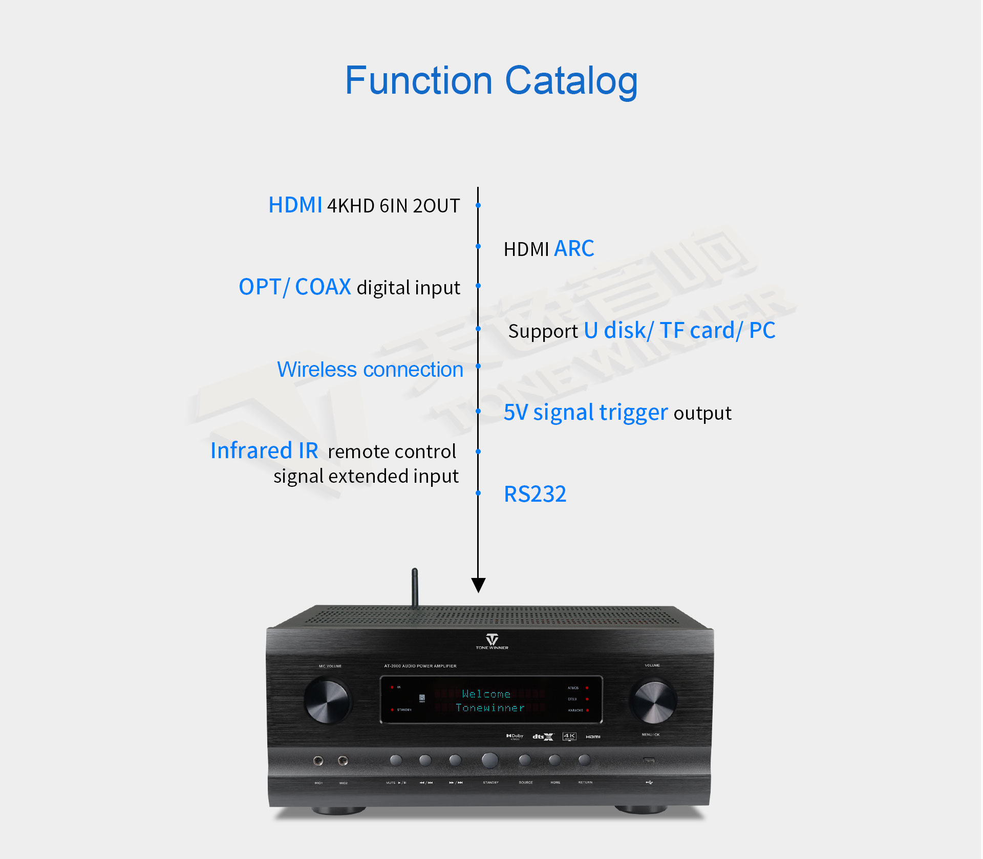 AT-2000 एक है ऑल-इन-वन पावर एम्पलीफायर सराउंड साउंड होम सिनेमा कराओके इंटीग्रेटेड एम्पलीफायर एवी रिसीवर यह डॉल्बी एटमॉस और डीटीएस:एक्स साउंड इफेक्ट्स को सपोर्ट करता है और 4K वीडियो तकनीक को भी सपोर्ट करता है। यह 3D, HDR, डॉल्बी विज़न और अन्य वीडियो फॉर्मेट के साथ भी संगत है। यह यू डिस्क और टीएफ कार्ड को भी सपोर्ट करता है। 11 चैनल एवी रिसीवर यह कई तरह के लॉसलेस और हाई-कंप्रेशन ऑडियो फॉर्मेट को सपोर्ट करता है। यह मोबाइल ऐप कंट्रोल, वायरलेस लॉसलेस ट्रांसमिशन और ARC को भी सपोर्ट करता है। उच्च स्तरीय ऑडियो और वीडियो एम्पलीफायर जो घरेलू मनोरंजन की सभी जरूरतों को पूरी तरह से पूरा कर सके।