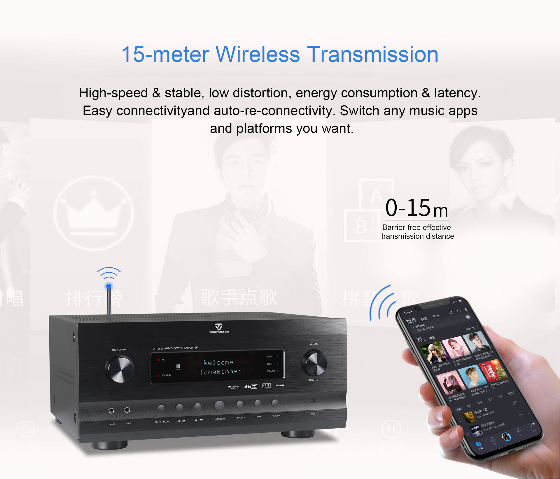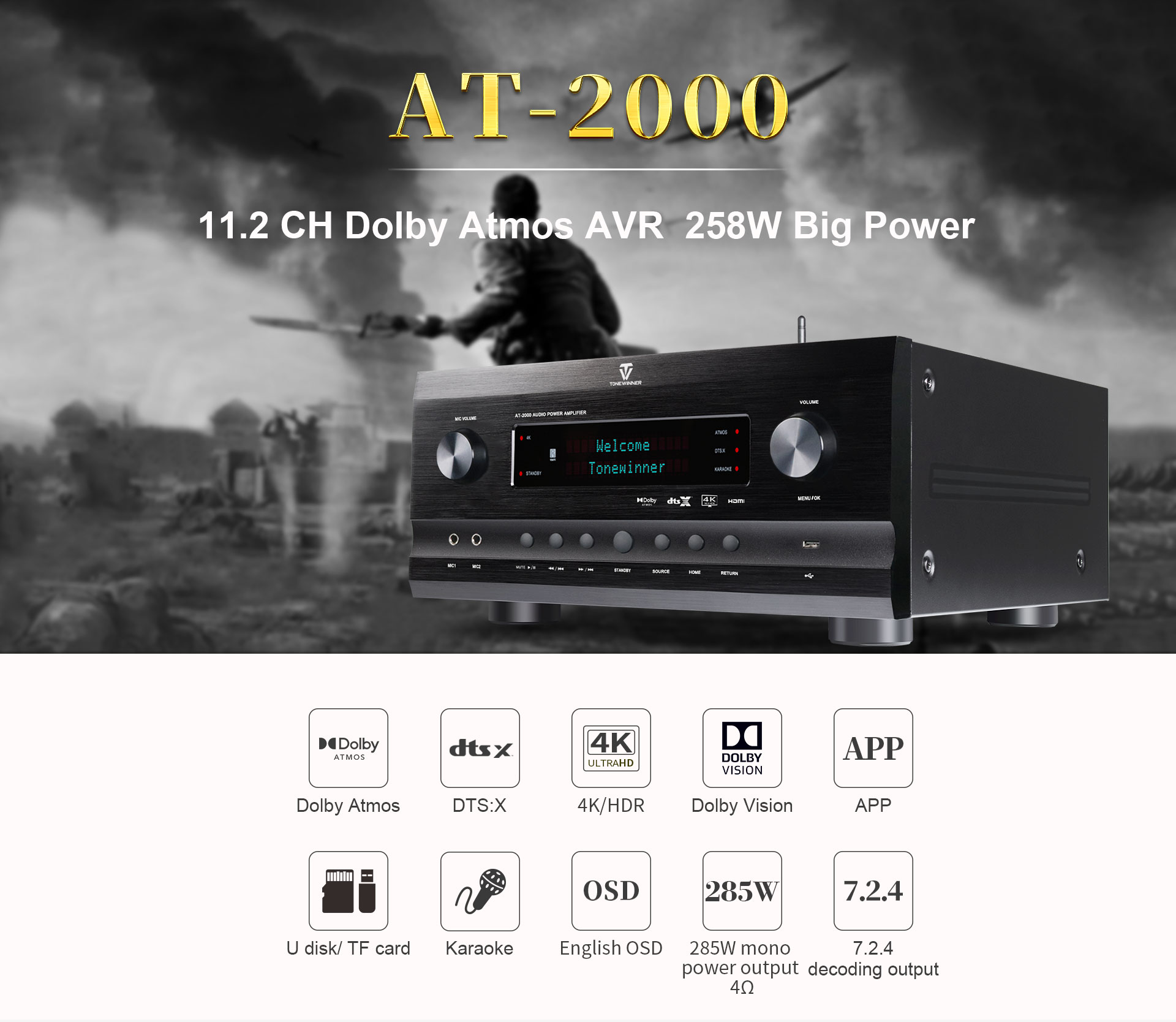 AT-2000 एक उच्च श्रेणी का होम थिएटर और कराओके इंटीग्रेटेड एम्पलीफायर है। यह डॉल्बी एटमॉस और डीटीएस:एक्स को सपोर्ट करता है और इन साउंड फॉर्मेट के सभी पिछले संस्करणों के साथ भी संगत है। यह 4K, 3D, HDR, डॉल्बी विज़न, ARC ऑडियो प्लेबैक, माइक्रोफ़ोन ऐप कंट्रोल, USB डिस्क, TF कार्ड और कई लॉसलेस और कंप्रेस्ड ऑडियो फॉर्मेट को सपोर्ट करता है। इसे 7.2.4 सिस्टम के रूप में सेट किया जा सकता है, जो कराओके का एक शानदार अनुभव प्रदान करता है।