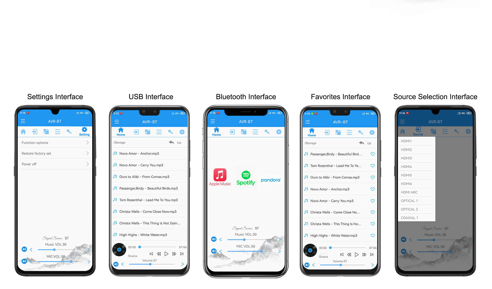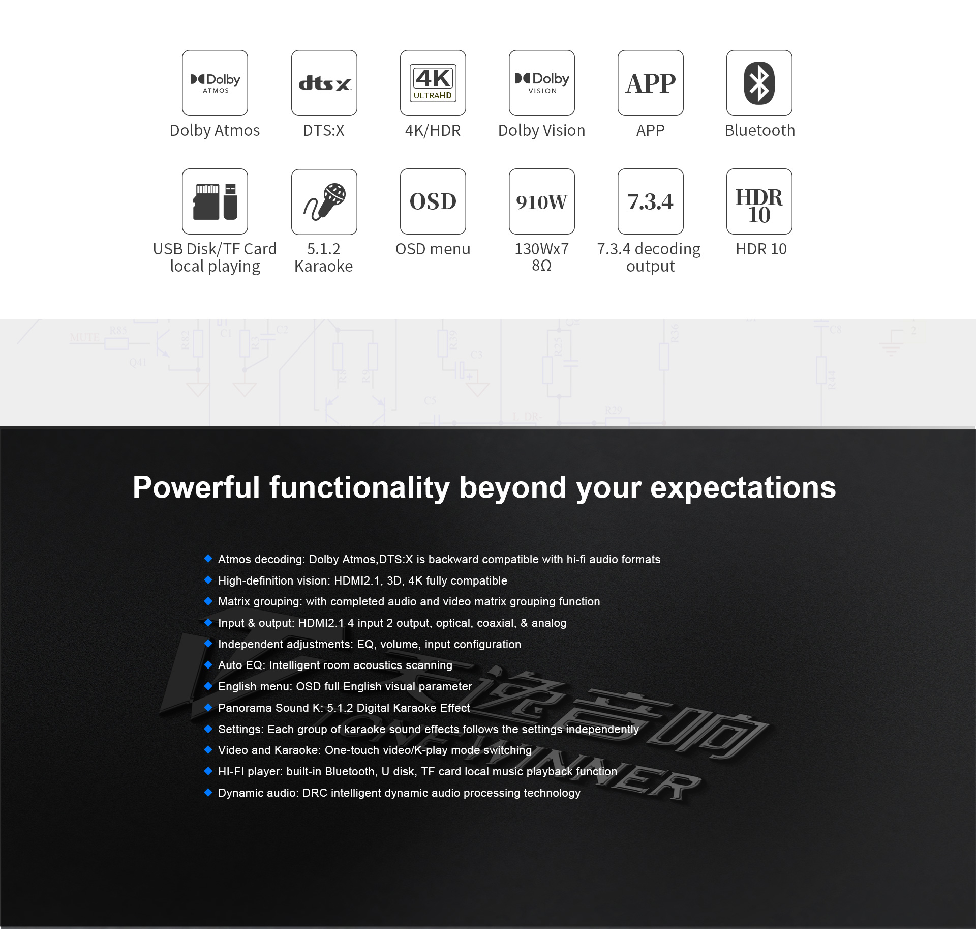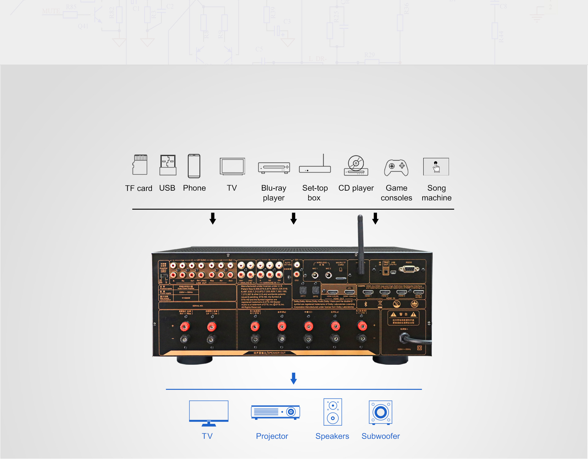 HDMI 4-इन 2-आउट, ARC, ऑप्टिकल/कोएक्सियल डिजिटल इनपुट, USB ड्राइव/TF कार्ड/PC ऑडियो इनपुट, ब्लूटूथ लॉसलेस ट्रांसमिशन, 5V ट्रिगर आउटपुट, IR इनपुट और RS232 मानक नियंत्रण पोर्ट का समर्थन करता है।