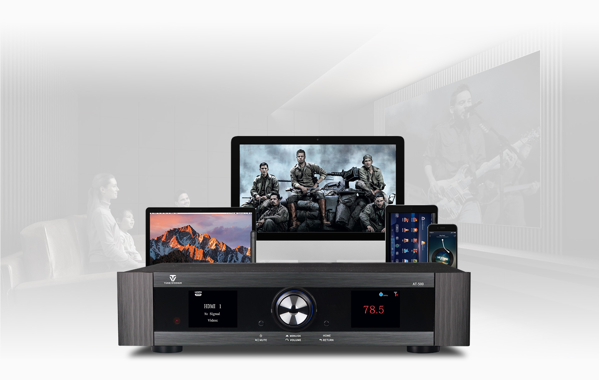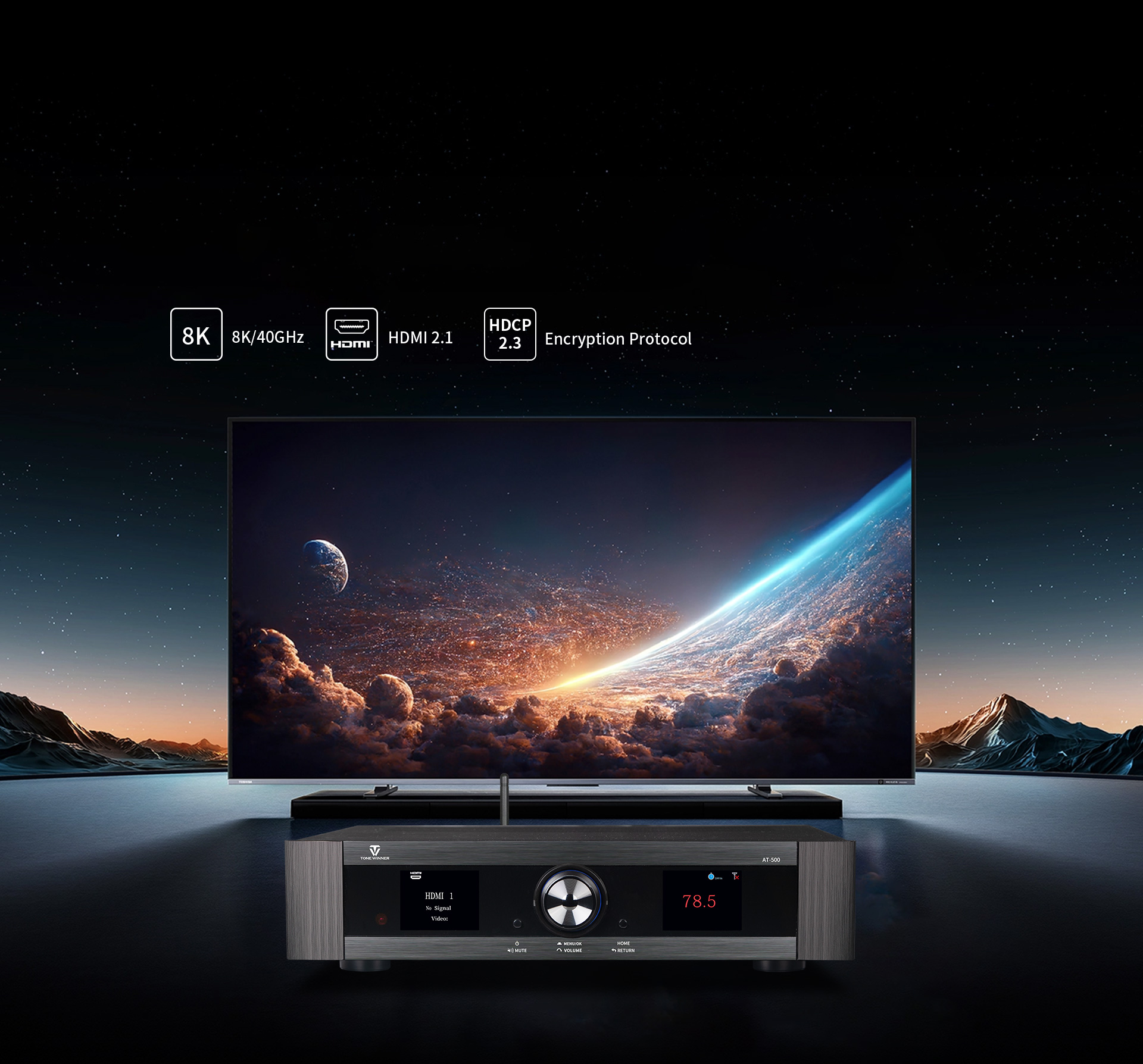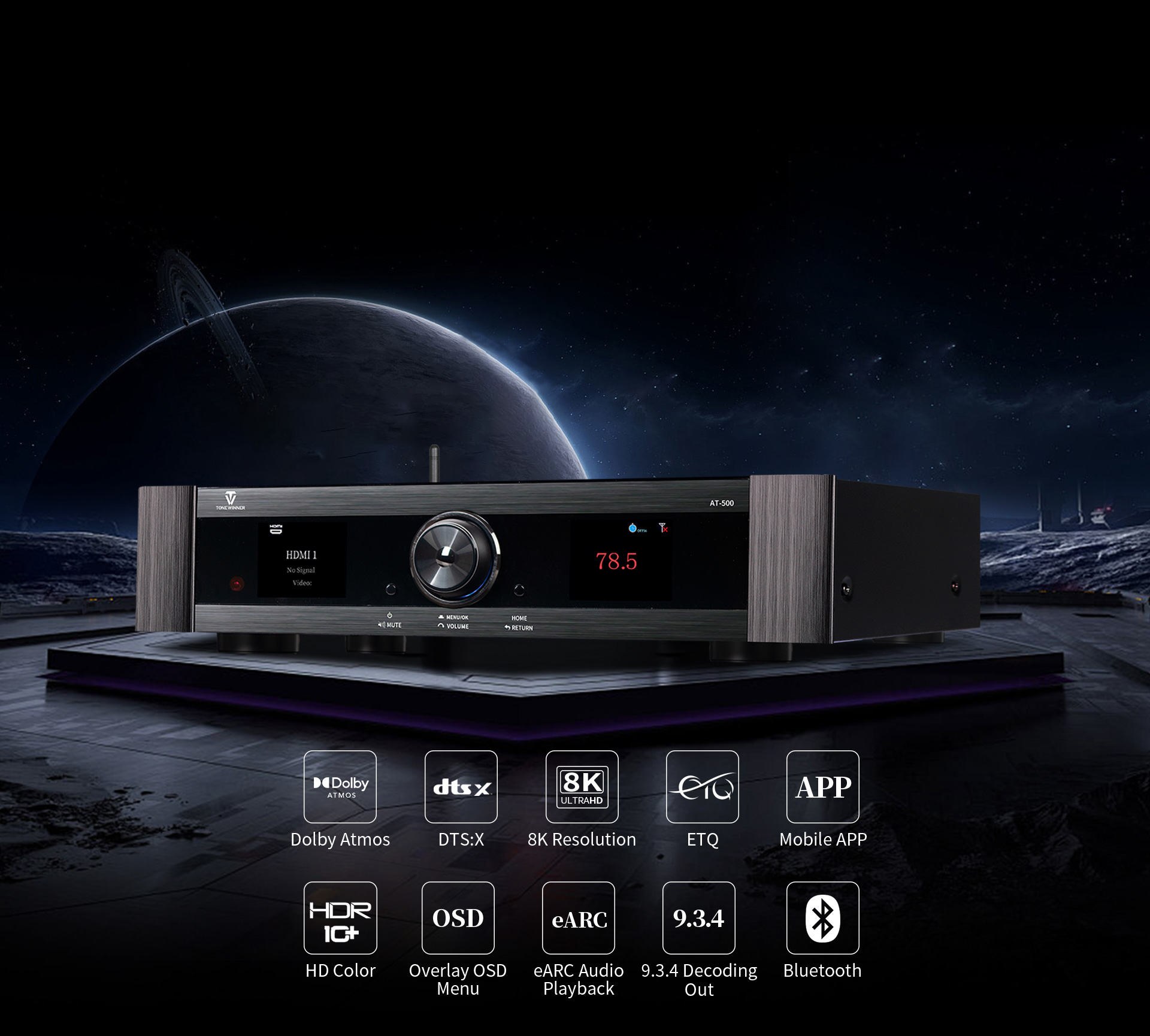 AT-500 एक 8K इमर्सिव AV प्रोसेसर है जिसे उच्च-स्तरीय निजी सिनेमाघरों के लिए विकसित किया गया है। यह 8K वीडियो तकनीक के साथ-साथ डॉल्बी एटमॉस इमर्सिव ऑडियो इफेक्ट्स और DTS:X इमर्सिव साउंड को सपोर्ट करता है। यह 3D, HDR10+ और डॉल्बी विज़न जैसे वीडियो फॉर्मेट के साथ संगत है। यह एक अल्ट्रा-हाई-डेफिनिशन ऑडियो-विजुअल हब है जो एक सिनेमा सिस्टम और एक म्यूजिक सेंटर दोनों को एकीकृत करता है।