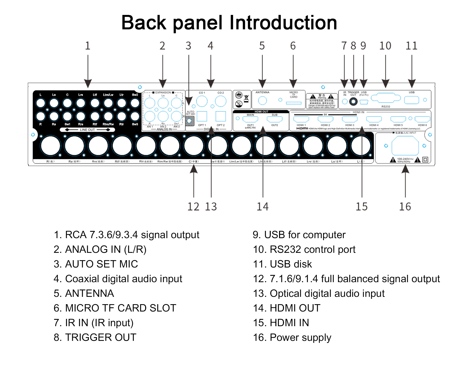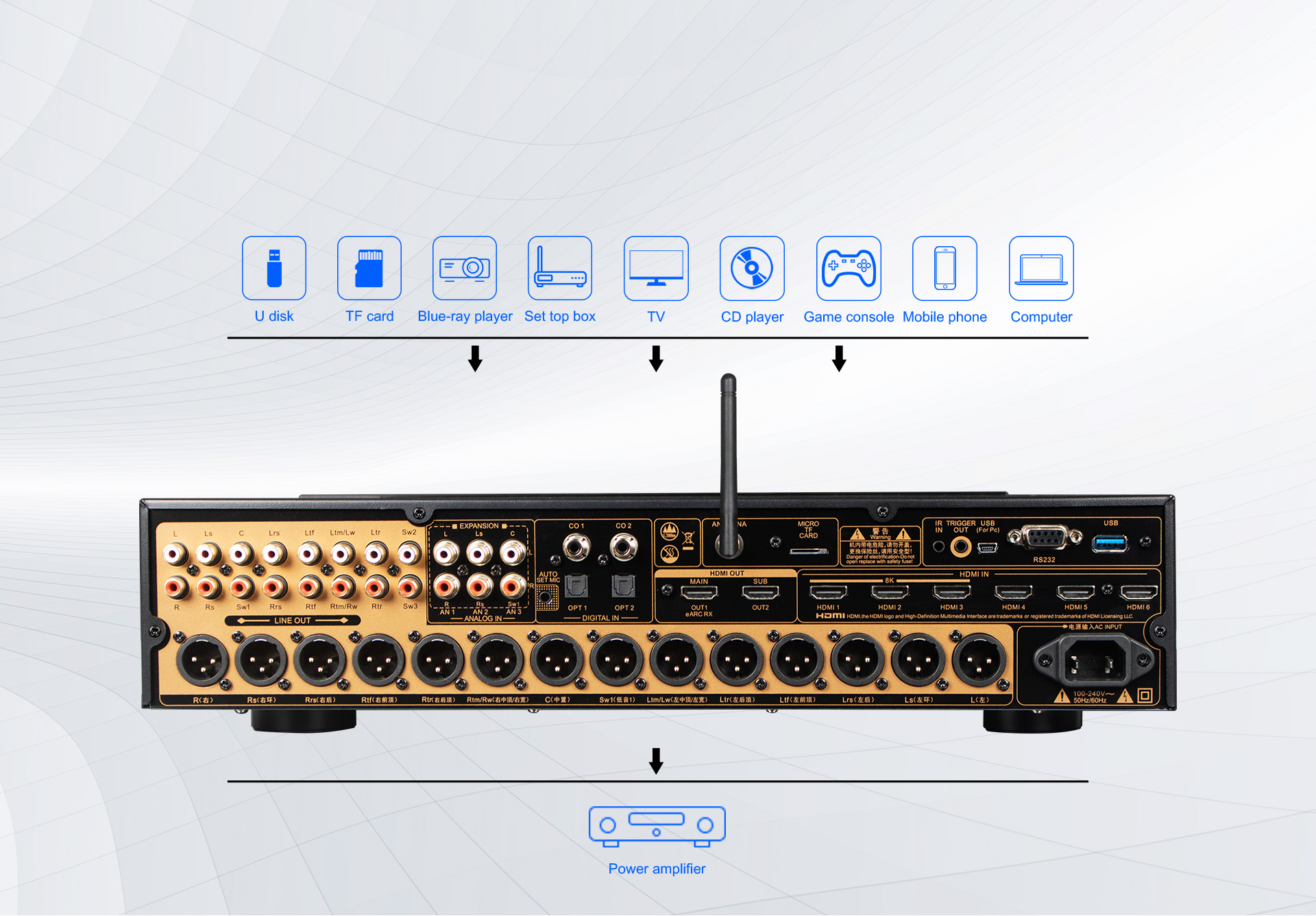 HDMI 6 इन 2 आउट, eARC ऑडियो प्लेबैक, ऑप्टिकल/समाक्षीय डिजिटल इनपुट, यू डिस्क/TF कार्ड/PC ऑडियो इनपुट, ब्लूटूथ, 5V ट्रिगर आउटपुट, इन्फ्रारेड IR इनपुट, RS232 मानक नियंत्रण पोर्ट का समर्थन करता है।