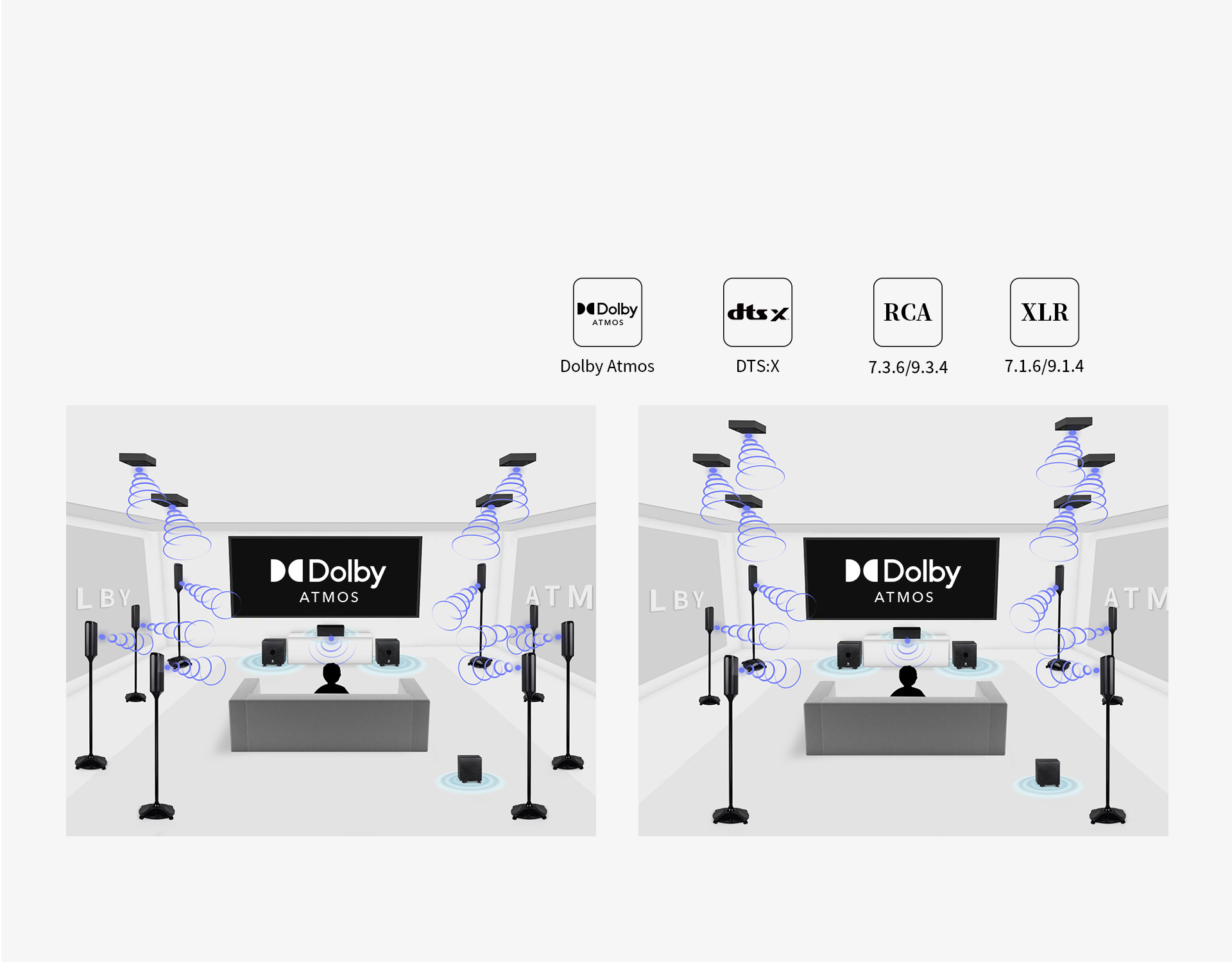 यह 7.3.6/9.3.4, डॉल्बी एटमॉस ध्वनि डिकोडिंग आउटपुट के कुल 16 चैनलों का समर्थन करता है, और चौंकाने वाली निम्न आवृत्तियों को बनाने, ध्वनि क्षेत्र की सटीक लेयरिंग और इमर्सिव सराउंड प्राप्त करने के लिए 3 सबवूफ़र्स को स्वतंत्र रूप से नियंत्रित कर सकता है।