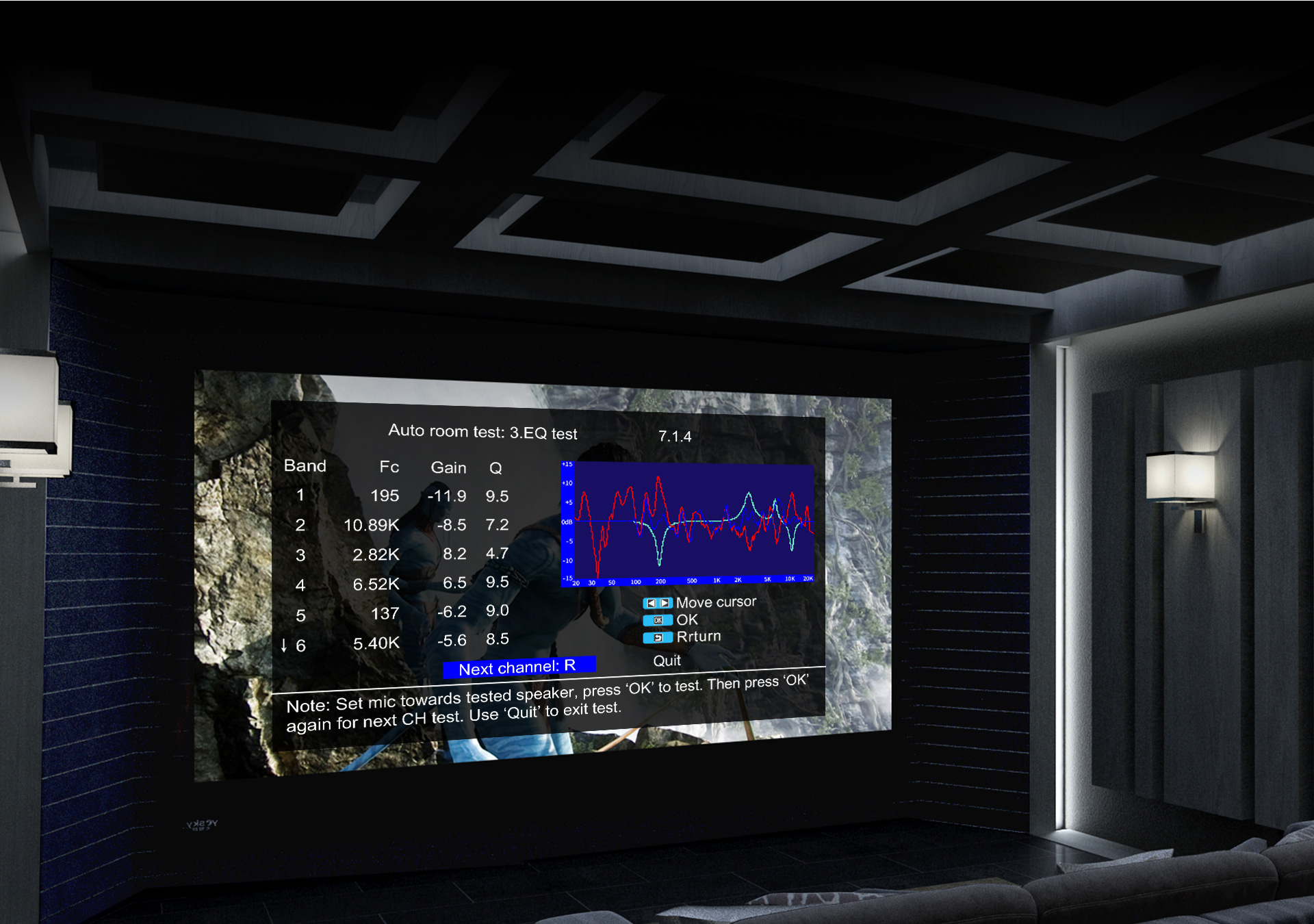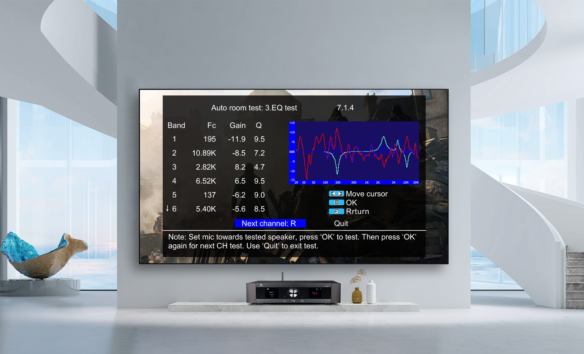 यह स्वचालित और मैनुअल मल्टी-बैंड पैरामीट्रिक EQ से सुसज्जित है, जिसमें बाएं और दाएं मुख्य स्पीकर और केंद्र चैनल के लिए 11 बैंड, सराउंड और ओवरहेड चैनलों के लिए 5 बैंड और बास चैनल के लिए 5 बैंड हैं।