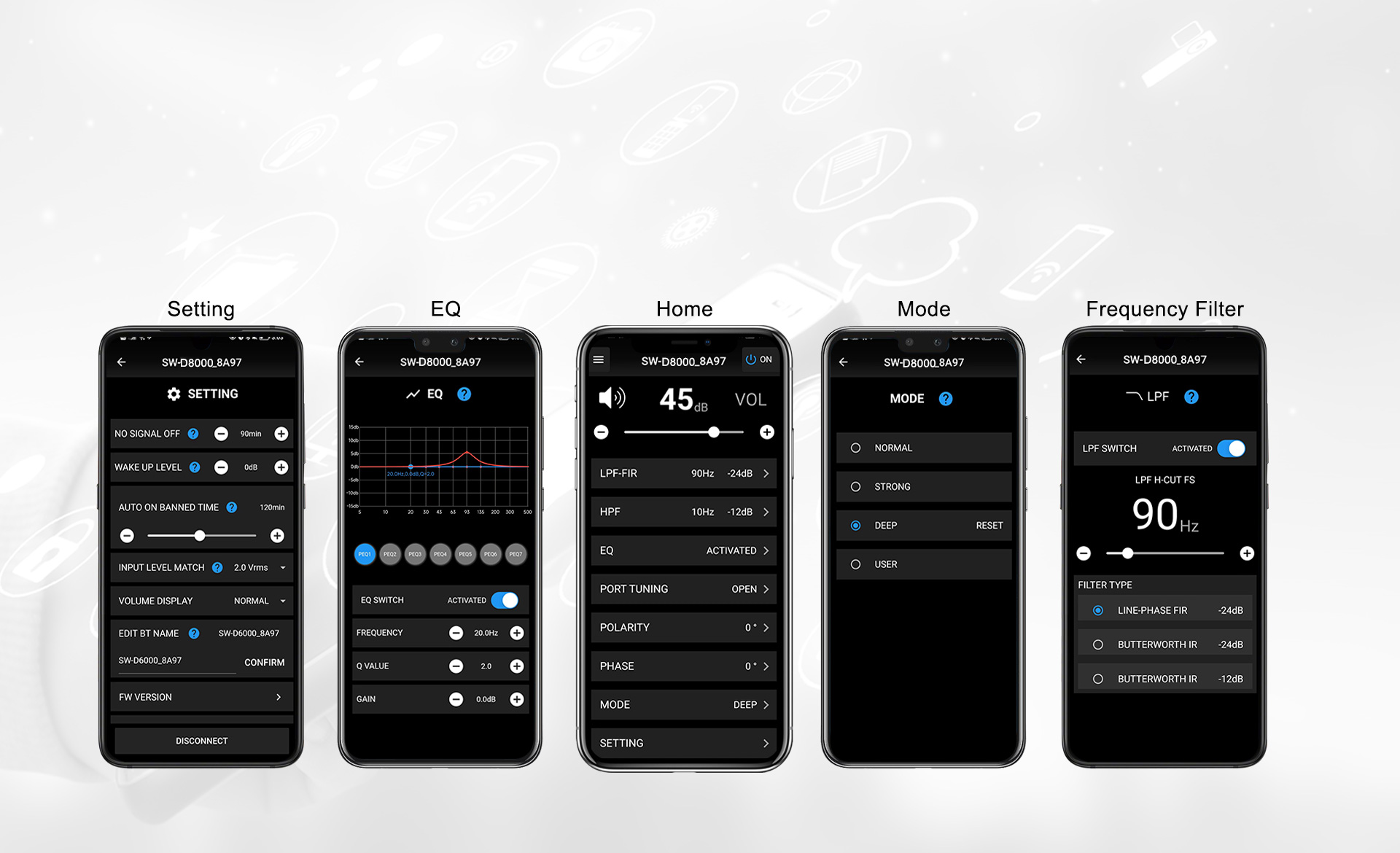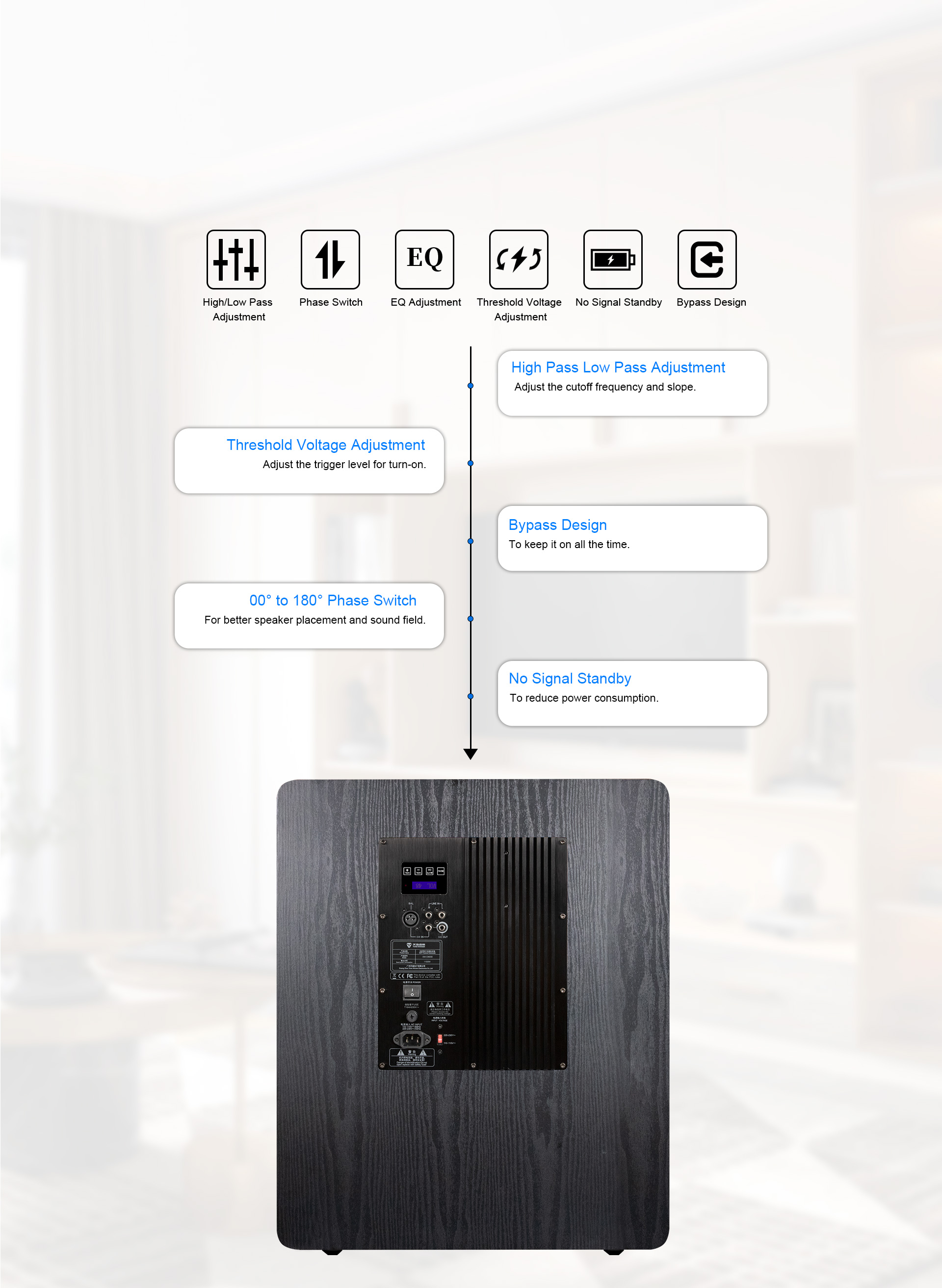 डीएसपी डिजिटल प्रसंस्करण, एलसीडी डिस्प्ले, टच बटन, ऐप नियंत्रण, वायरलेस फर्मवेयर अपग्रेड, ईक्यू समायोजन, आवृत्ति रेंज समायोजन, 0 डिग्री से 180 डिग्री चरण स्विचिंग, संतुलित इनपुट, सिग्नल के बिना स्वचालित बिजली की बचत।