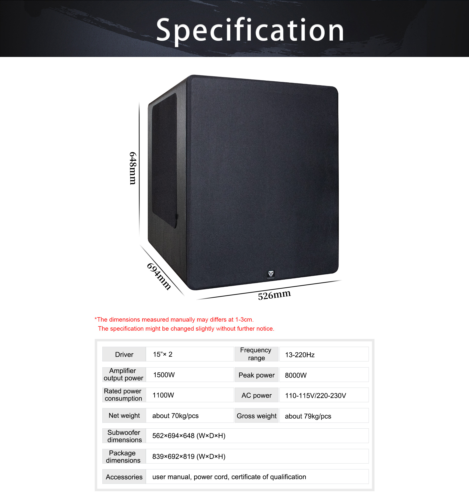 ड्राइवर | 15''×2 | बिजली की आपूर्ति | 110-115V/220-230V, 50Hz/60Hz |