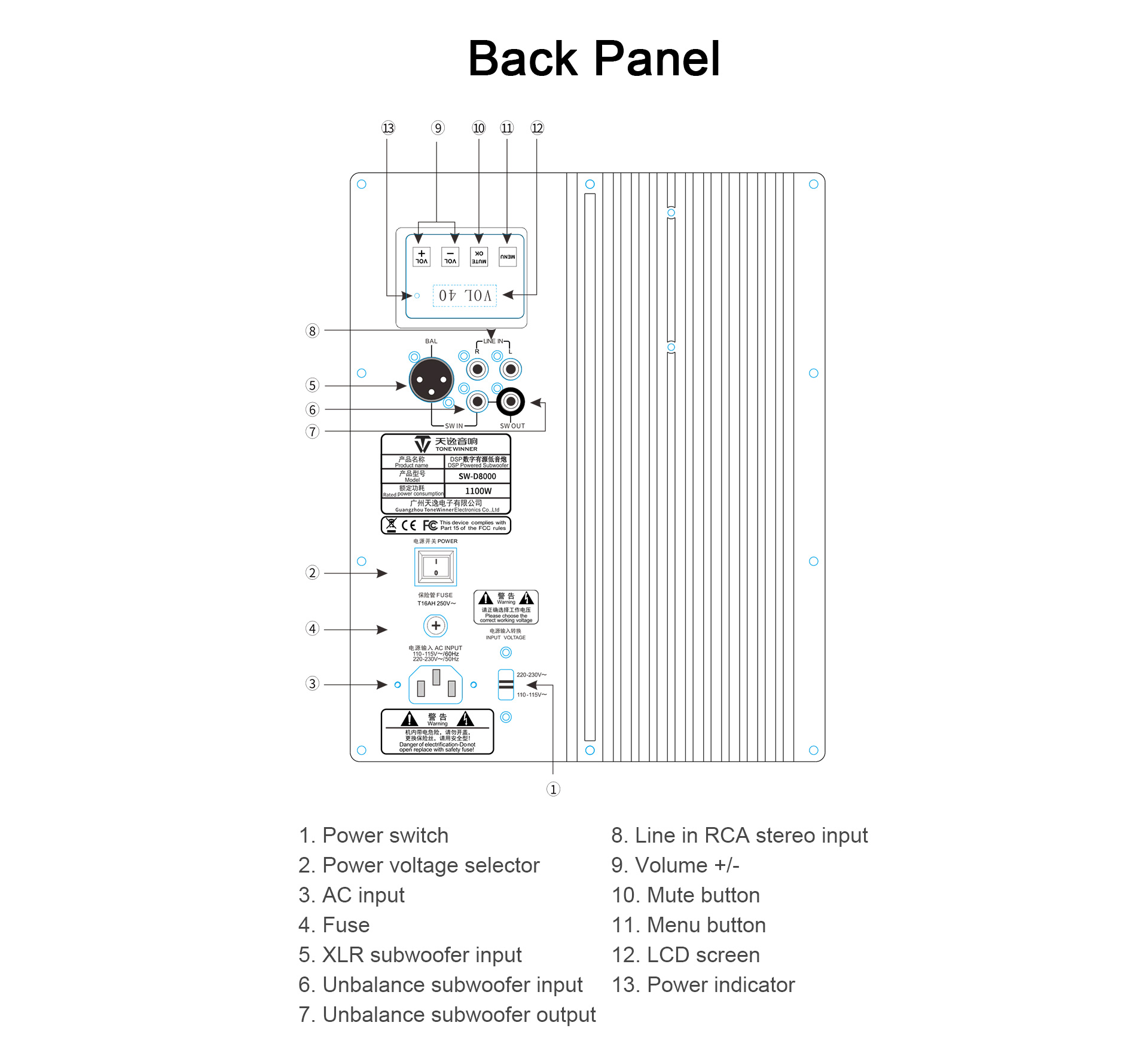 SW-D8000 एक डुअल 15 इंच का DSP पावर्ड सबवूफर है, जिसमें 1500W RMS/3Ω और 8000W/3Ω पीक पावर है। इसमें बिल्ट-इन DSP के साथ क्लास D एम्पलीफायर है। इसमें वॉल्यूम एडजस्ट करने, पोर्ट ट्यूनिंग, पोलरिटी, 0° से 180° फेज़, HPF, LPF, स्लोप, EQ, नो सिग्नल स्टैंडबाय, वेक-अप लेवल, इनपुट लेवल मैच और चार लिसनिंग मोड के लिए बिल्ट-इन ब्लूटूथ और ऐप है। इसमें बिल्ट-इन ब्लूटूथ कनेक्टिविटी है और यह टोनविनर ऐप को सपोर्ट करता है। चीन के शीर्ष 10 ऑडियो ब्रांड्स में से एक, टोनविनर को ध्वनिक उत्पादों के डिज़ाइन और निर्माण में 30+ वर्षों का अनुभव है। एक मूल आपूर्तिकर्ता के रूप में, टोनविनर दुनिया भर के वितरकों, डीलरों, भागीदारों और ग्राहकों का हमेशा गर्मजोशी से स्वागत करता है।