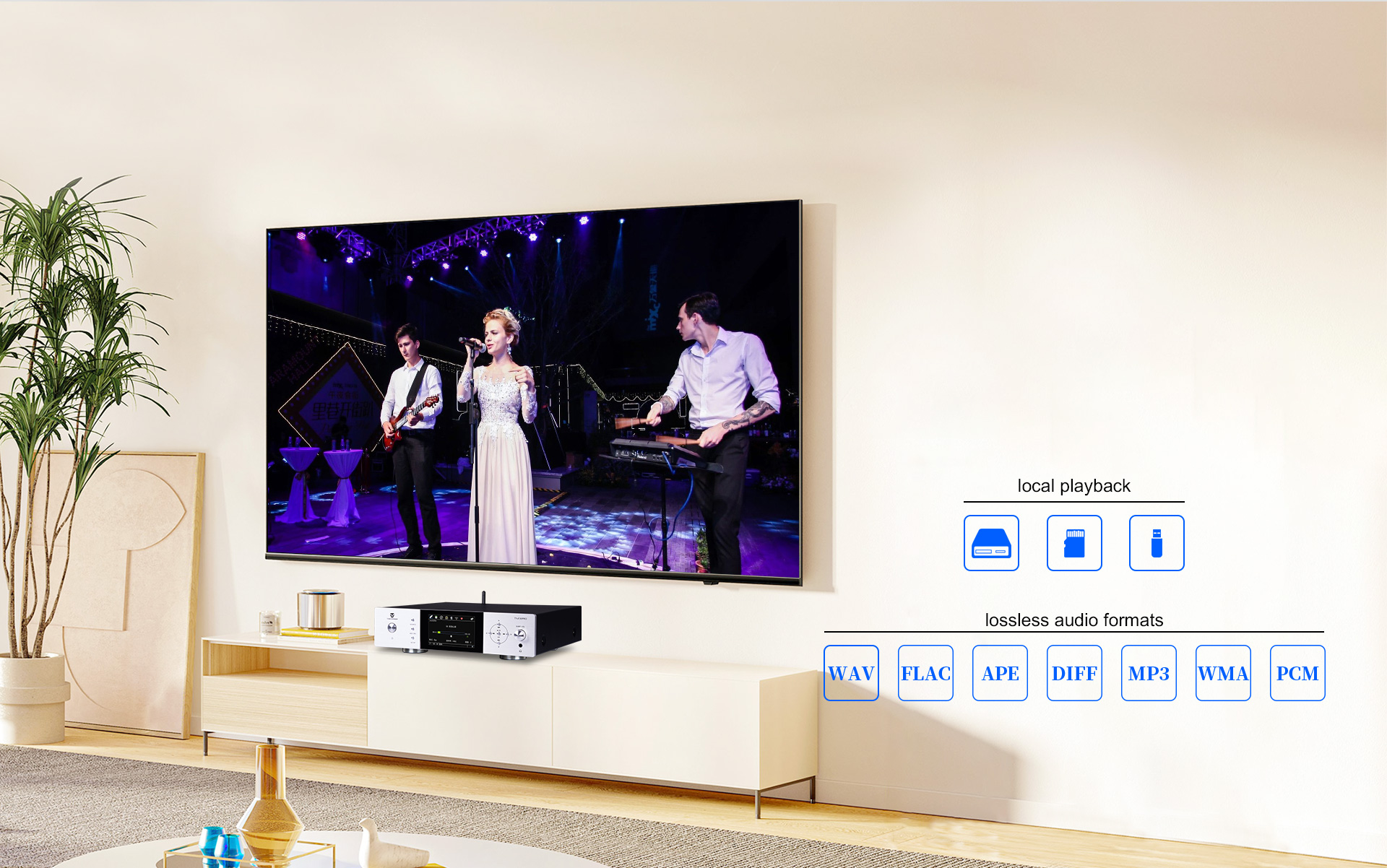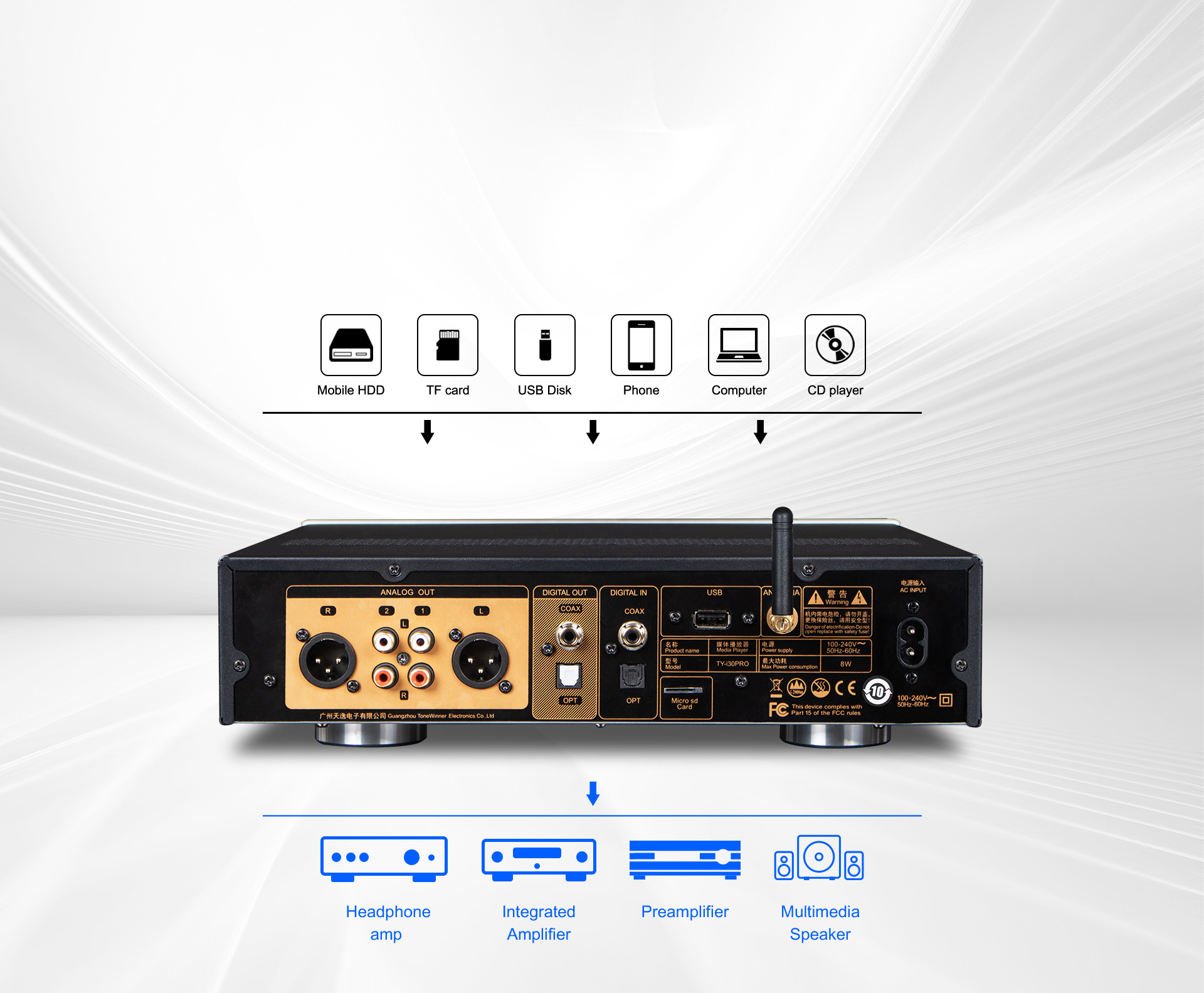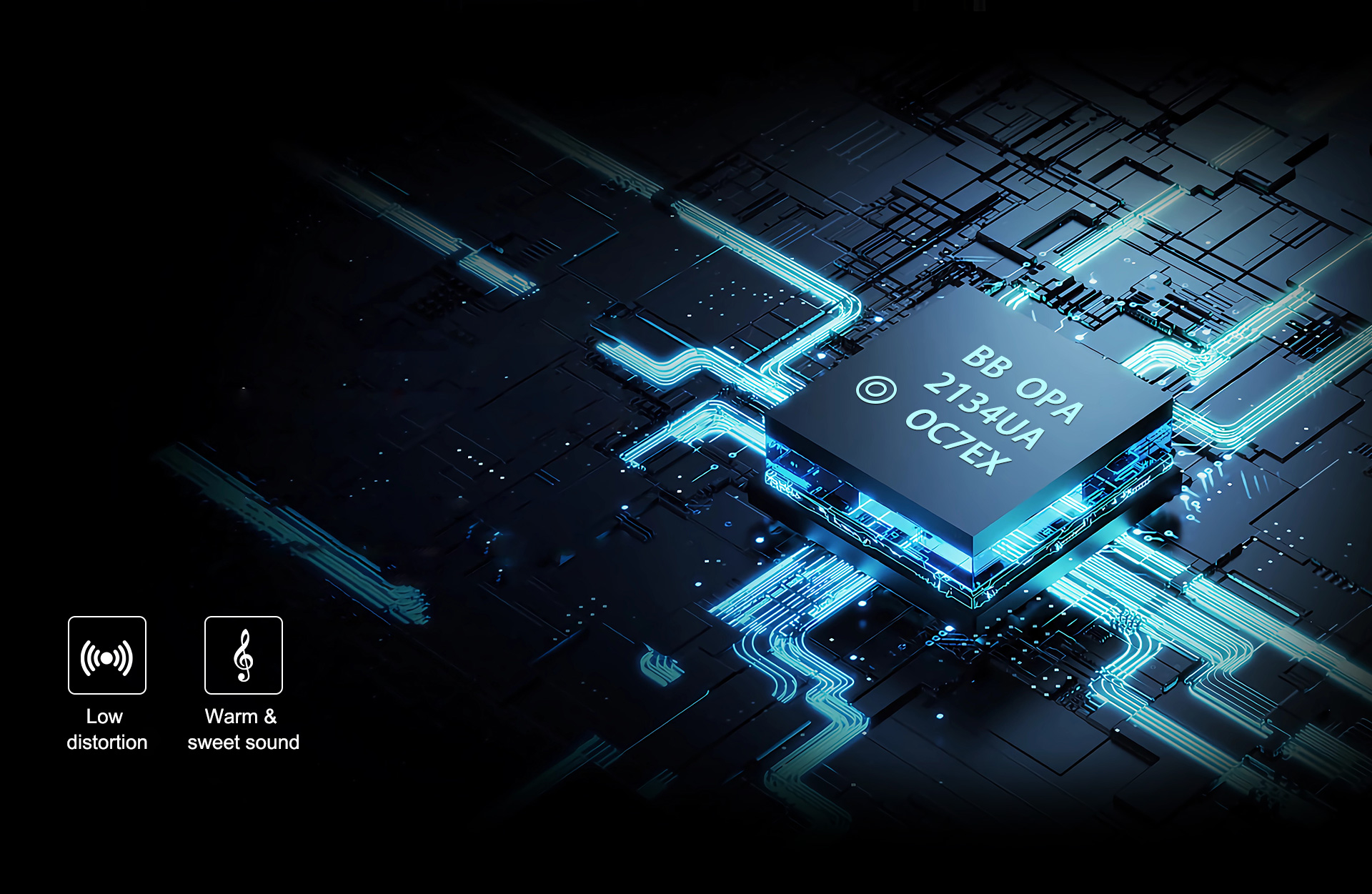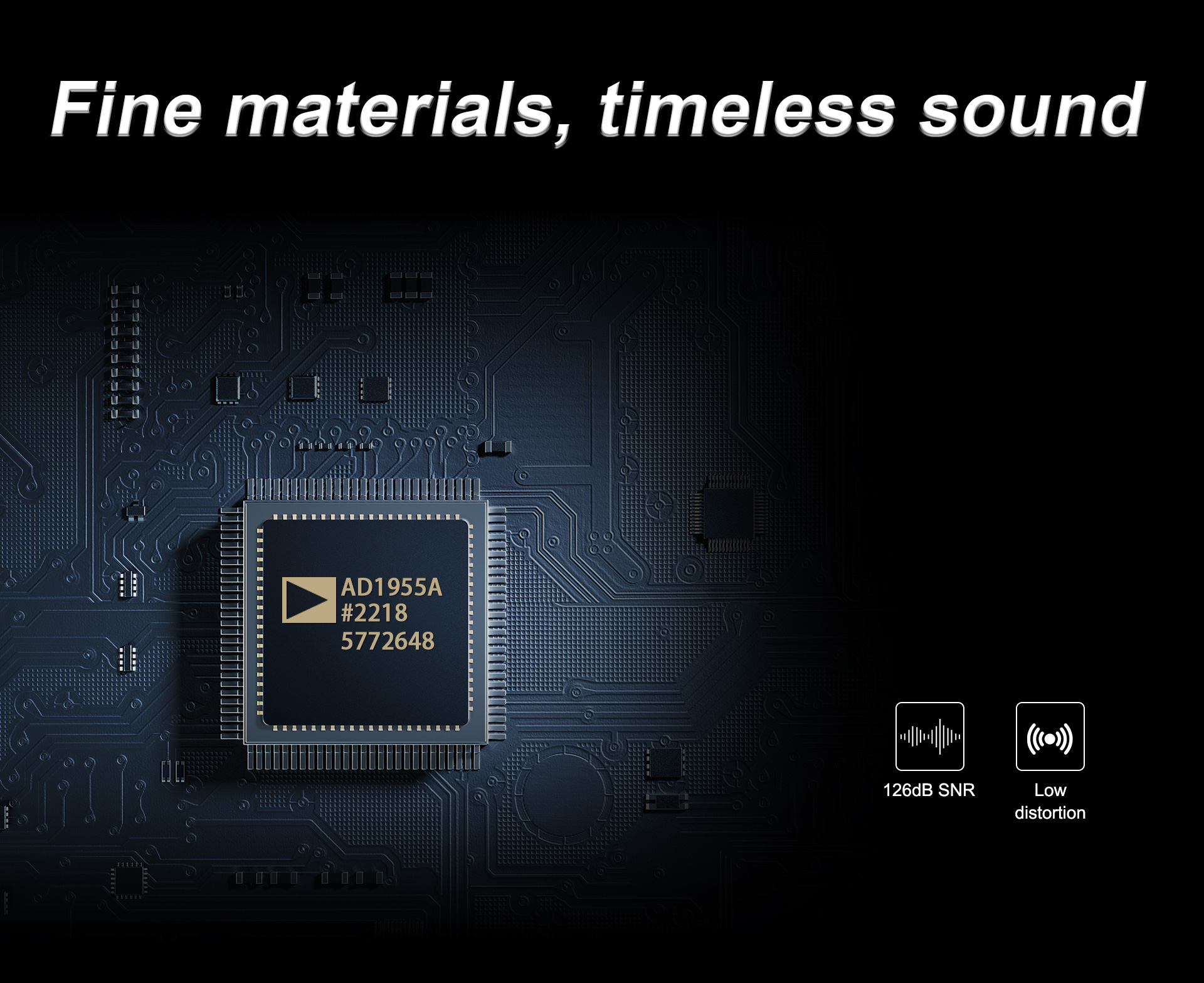 यू ऑडियोफाइल समुदाय से प्राप्त AD-1955 ऑडियो DAC चिप का उपयोग करते हुए, यह प्रभावशाली डायनामिक रेंज और 126dB का सिग्नल-टू-नॉइज़ अनुपात प्राप्त करता है, जिसमें कुल हार्मोनिक विरूपण -110dB जितना कम होता है। इसके अतिरिक्त, यह 108 एप्लिकेशन उत्पादों के साथ संगत है।