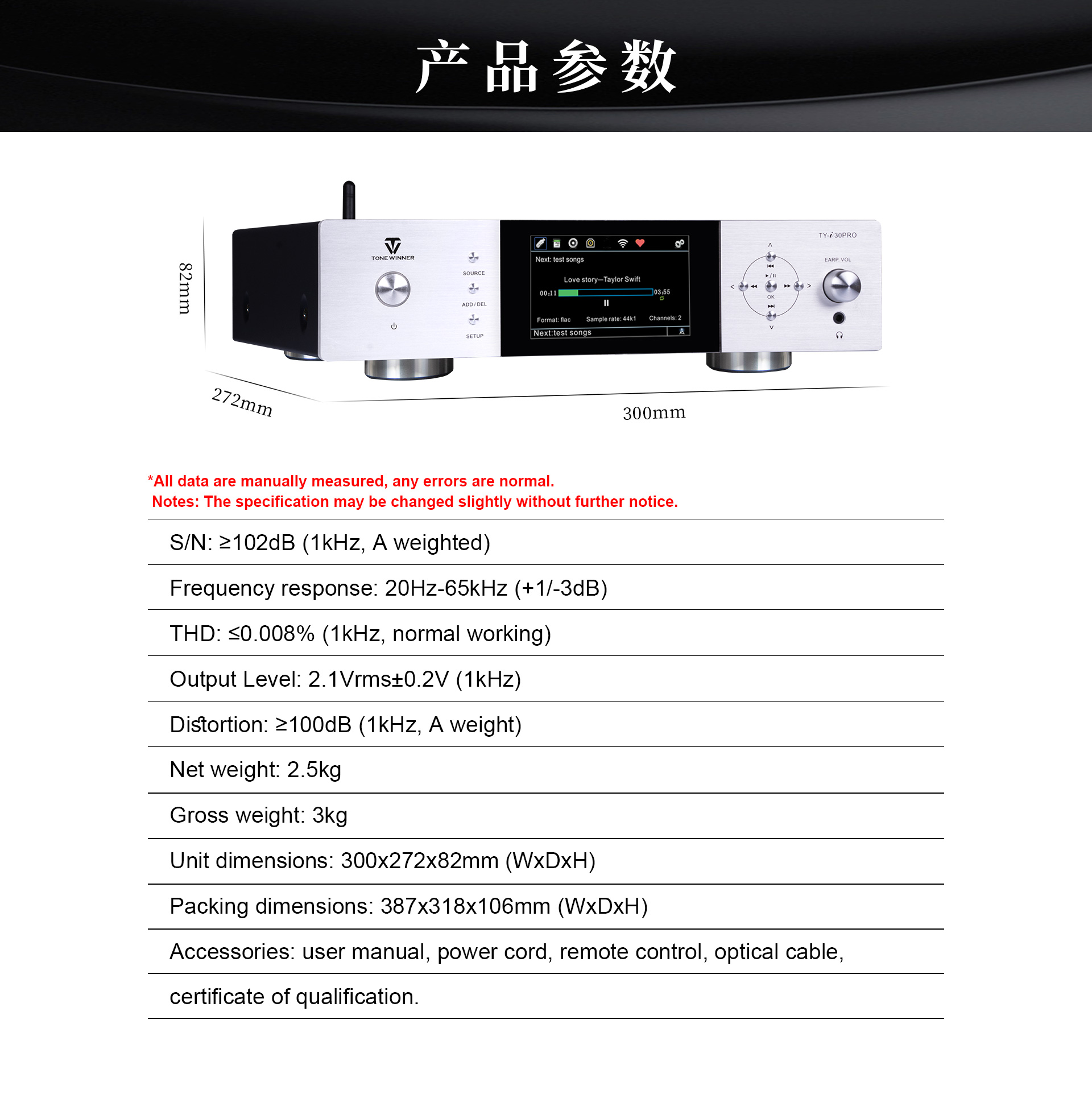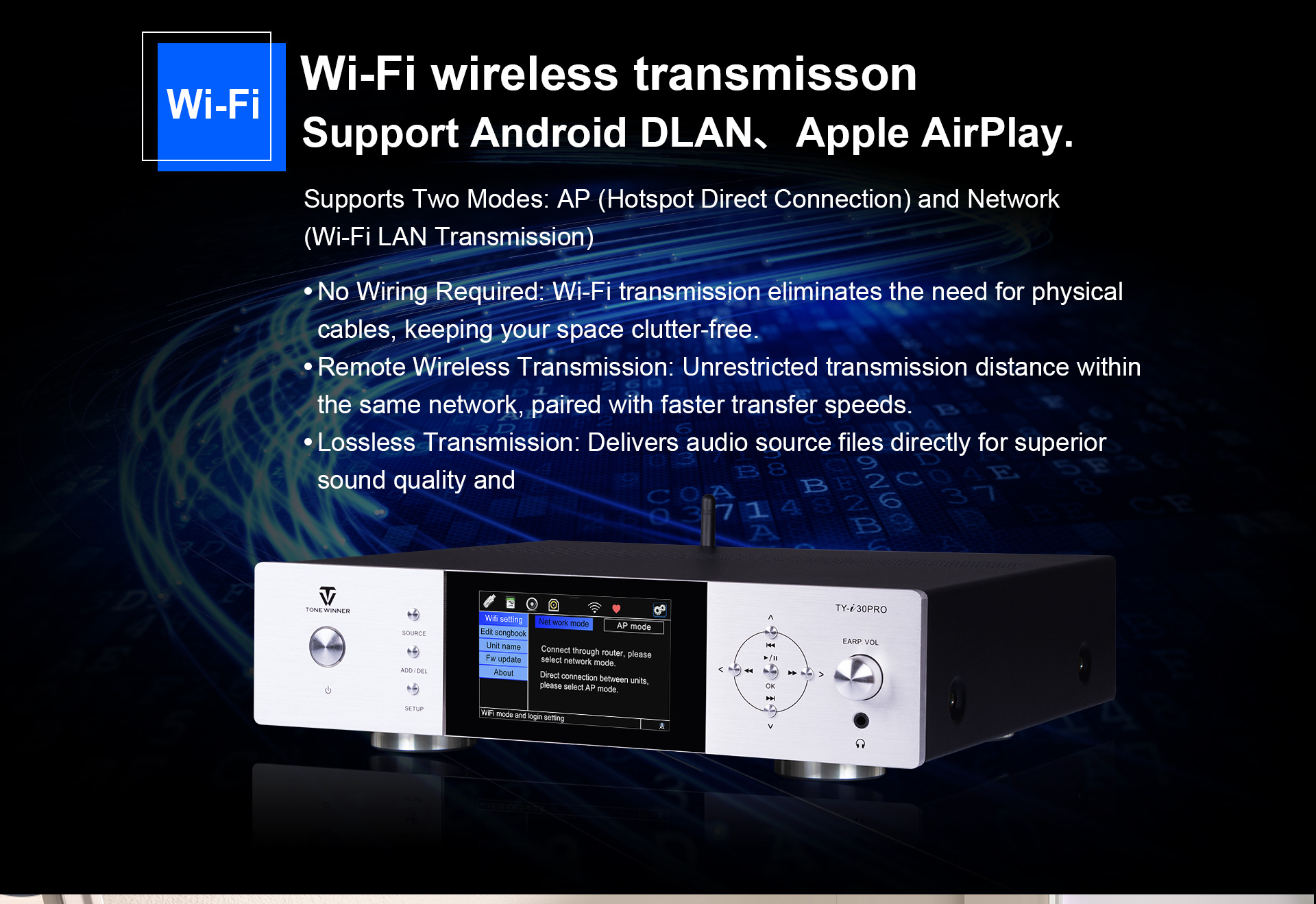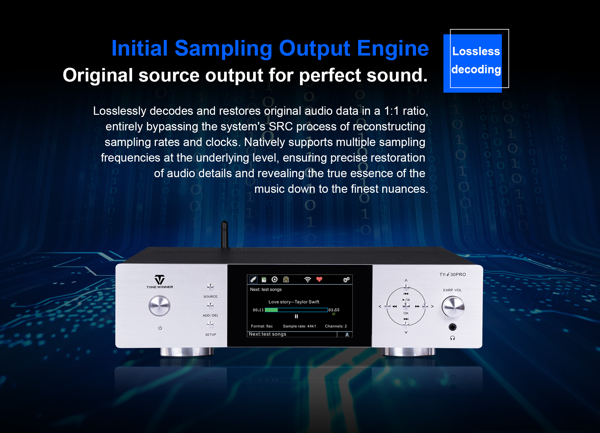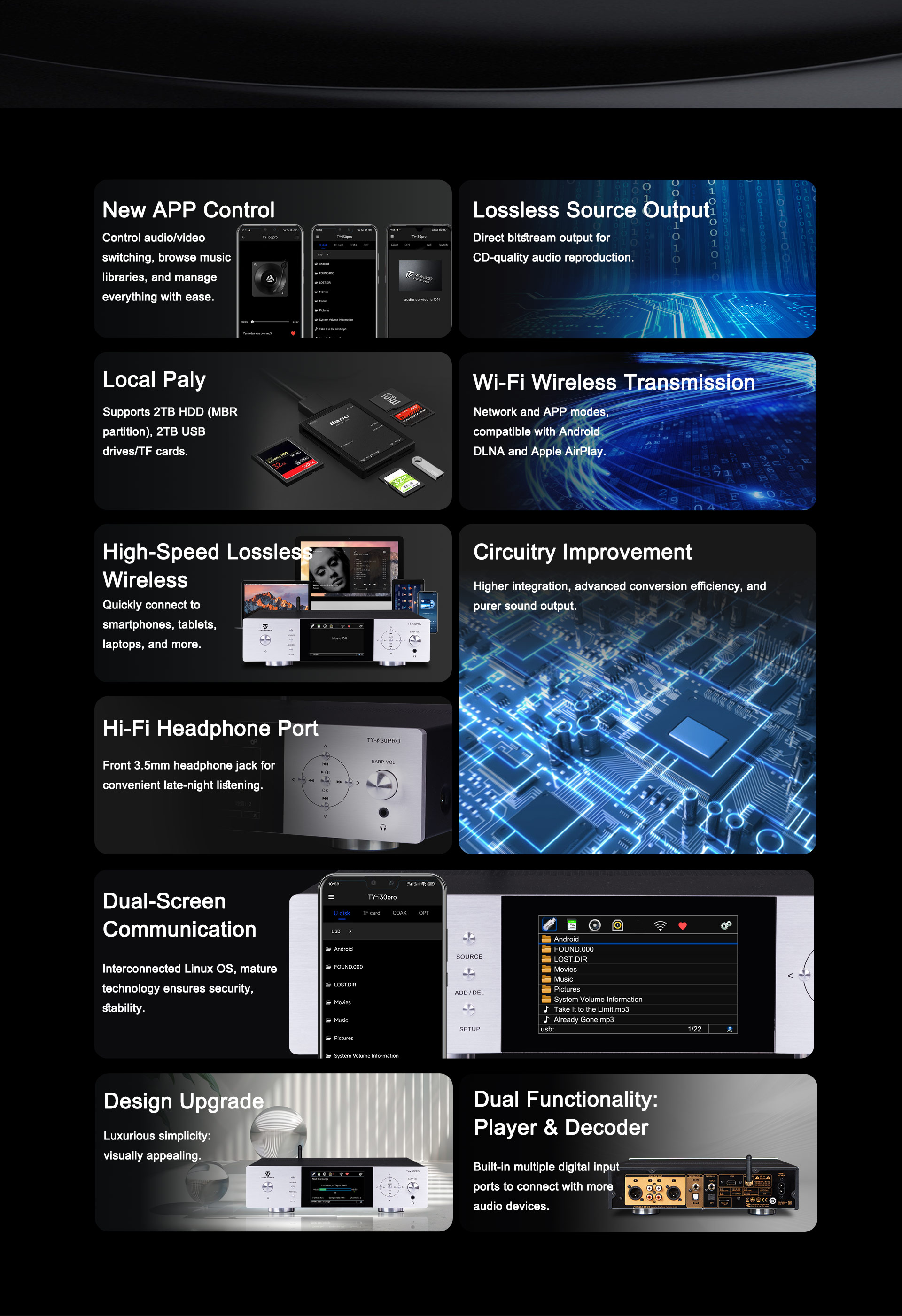 TY-i30PRO, ToneWinner द्वारा लॉन्च किया गया एक नया मल्टी-फंक्शनल मीडिया प्लेयर है। यह DLNA, AIRPLAY या वायरलेस कनेक्शन के माध्यम से मोबाइल फोन, iPad, नोटबुक और अन्य उपकरणों से गाने प्राप्त कर सकता है। TY-i30PRO 2TB मोबाइल हार्ड डिस्क, TF कार्ड और USB फ्लैश ड्राइव के लोकल प्लेबैक को सपोर्ट करता है, WAV/FLAC और APE जैसे लॉसलेस म्यूजिक फॉर्मेट को सपोर्ट करता है, इसमें फ्रंट में 3.5mm हेडफोन जैक है और यह ऑप्टिकल, कोएक्सियल, 192kHz/24Bit PCM डिजिटल स्ट्रीम फॉर्मेट इनपुट और आउटपुट को सपोर्ट करता है।