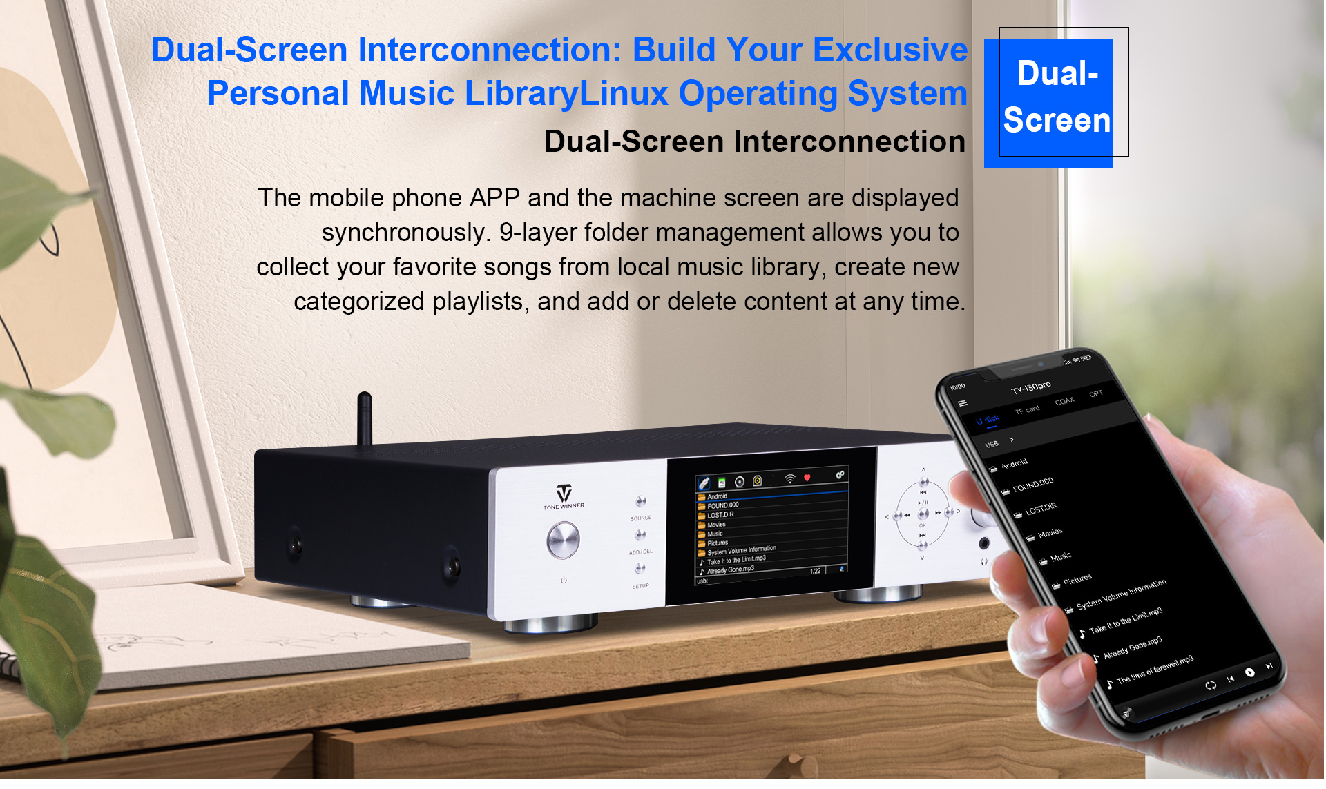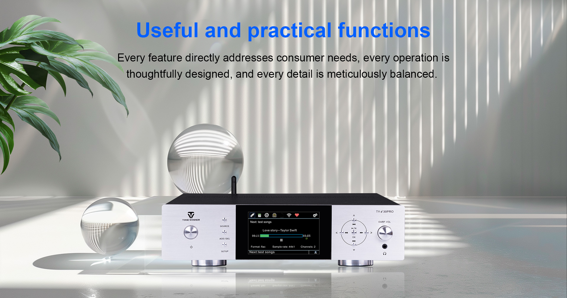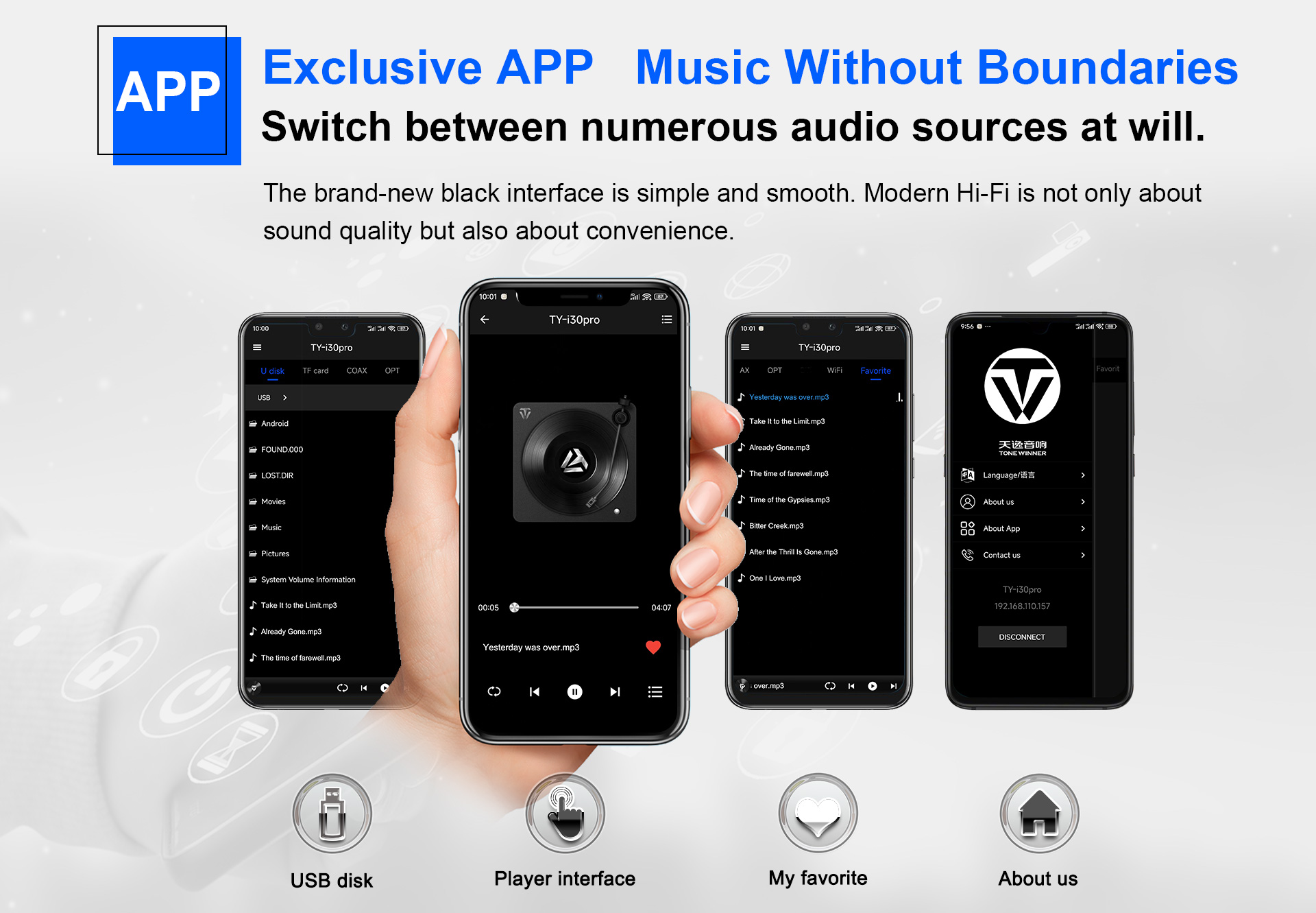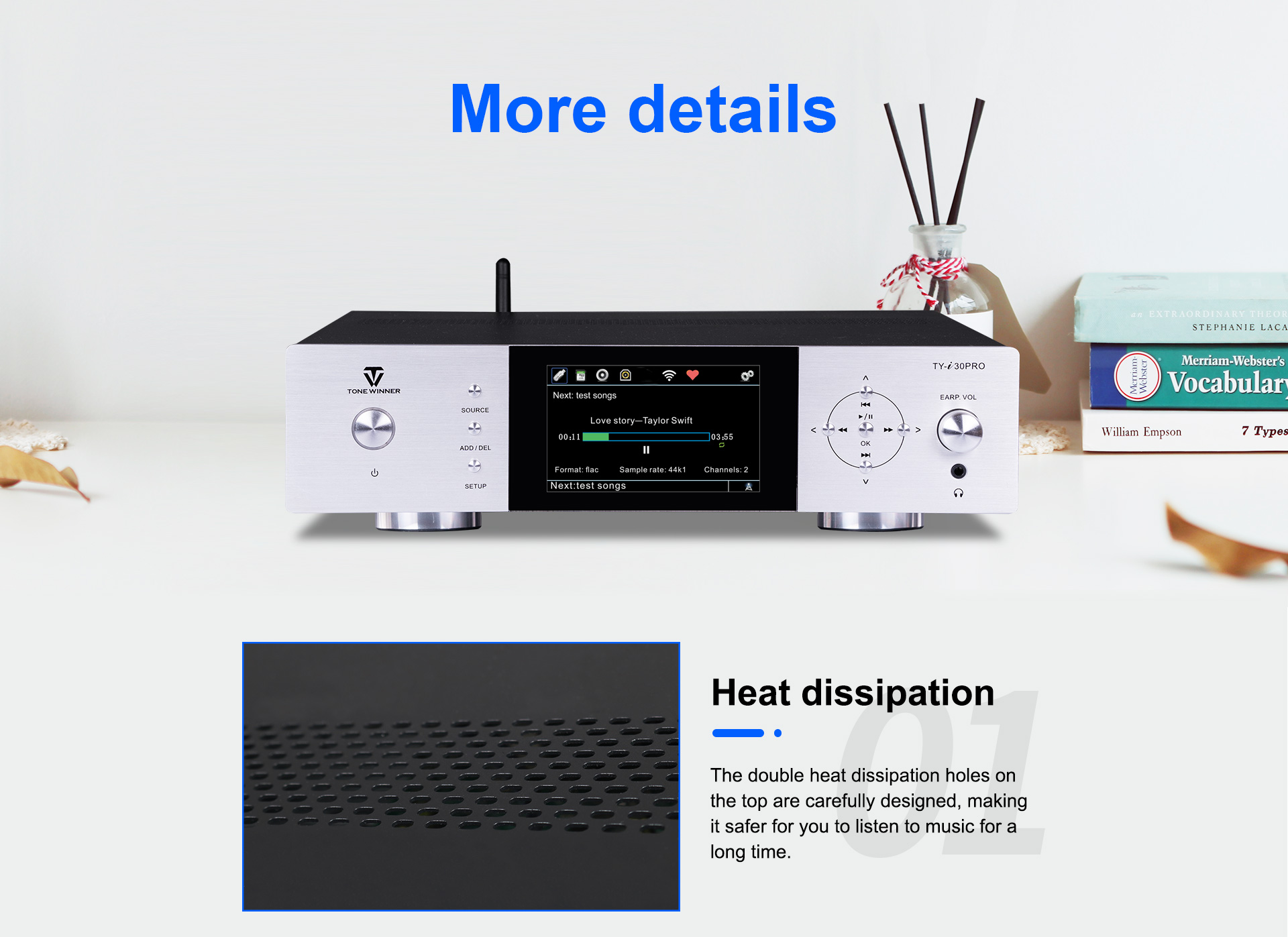 TY-i30PRO, ToneWinner द्वारा लॉन्च किया गया एक नया मल्टी-फंक्शनल मीडिया प्लेयर है। यह DLNA, AIRPLAY या वायरलेस कनेक्शन के माध्यम से मोबाइल फोन, iPad, नोटबुक और अन्य उपकरणों से गाने प्राप्त कर सकता है। TY-i30PRO 2TB मोबाइल हार्ड डिस्क, TF कार्ड और USB फ्लैश ड्राइव के लोकल प्लेबैक को सपोर्ट करता है, WAV/FLAC और APE जैसे लॉसलेस म्यूजिक फॉर्मेट को सपोर्ट करता है, इसमें फ्रंट में 3.5mm हेडफोन जैक है और यह ऑप्टिकल, कोएक्सियल, 192kHz/24Bit PCM डिजिटल स्ट्रीम फॉर्मेट इनपुट और आउटपुट को सपोर्ट करता है।